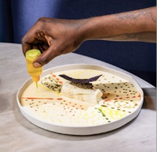 This dish, says Rito, is “a throwback to a big lobster raviolo” with pieces of handmade triangoli, filled with a spicy vodka sauce. She describes the vodka sauce as “deconstructed” because it’s a white cream sauce, sans tomatoes, that employs crème fraîche, butter, onions, shallots, and garlic. At the end, everything gets dusted with black garlic powder.