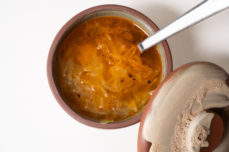 Unlike the French pickling method that employs acids like vinegar or lemon juice, the Turkish style relies on brine and a slow fermentation process. One of the key ingredients in Inak’s cabbage brine is cave salt, found underground near the Turkish town of Çankırı. (Whenever Inak’s friends are visiting from Turkey, he requests they bring him some.) To add a layer of umami, he includes chickpeas and sourdough bread for the starter. The fermentation requires the most time — two months — while the simmering of the soup takes about an hour and a half. “It’s a very special recipe,” says Vatansever. “In Western Turkey, nobody knows this soup. It’s specific to the region where his mom was born.”