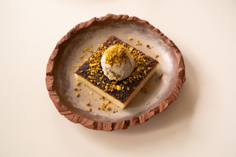 When Inak was living in Tekirdağ, he would drive two hours southwest to Çanakkale, the ancient city of Troy, to get a taste of the cheese halva that’s only found in that region. In his recreation of this memory, he stays true to the traditional recipe — one that results in a sweet and lightly salty slice of what could be considered a denser, chewier cheesecake with a crispy, caramelized crust — but updates it with the addition of a scoop of housemade yuzu and black sesame ice cream.
