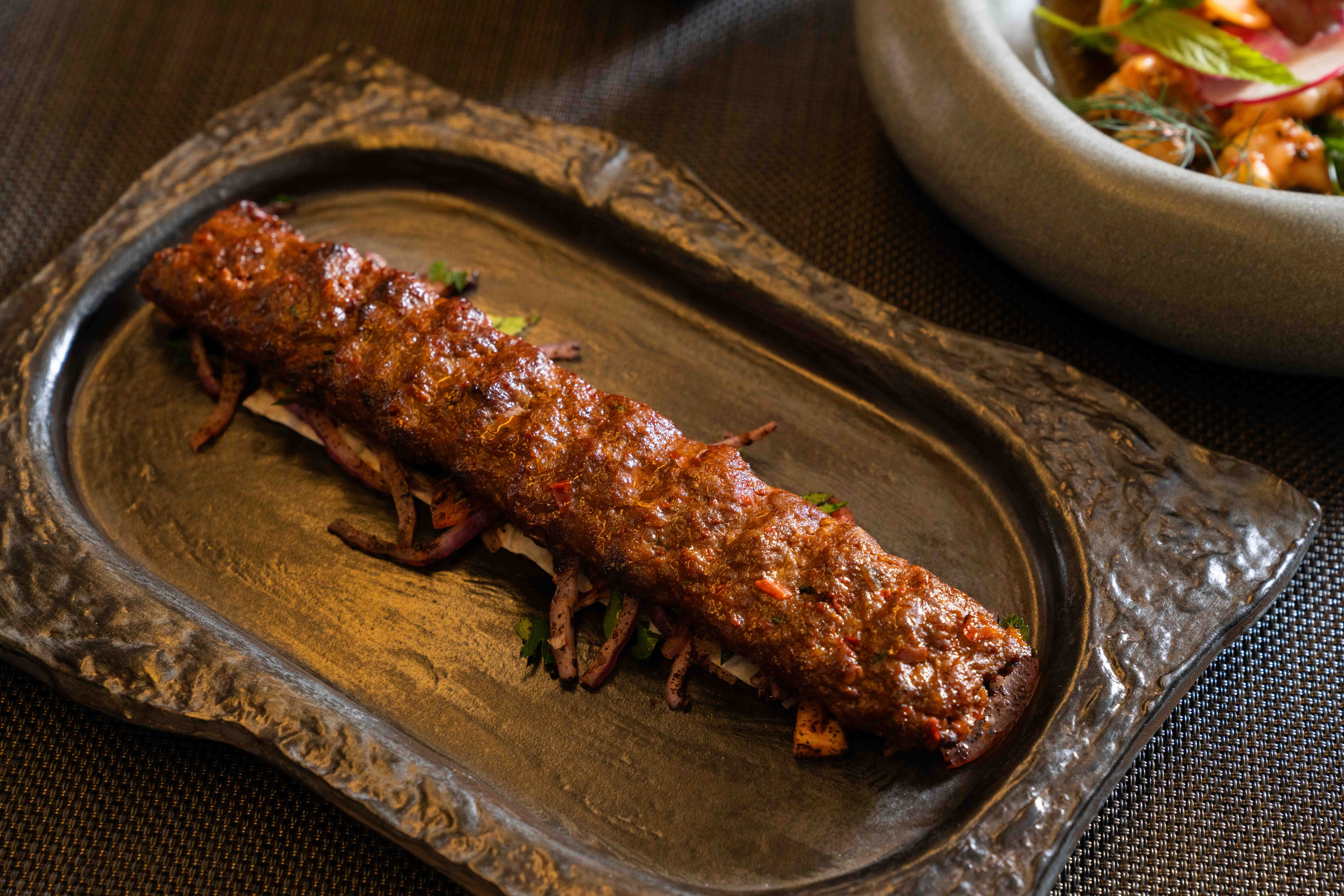The perfect fat-to-meat ratio is important to achieve succulent and juicy results. Inak grinds beef rib meat and mixes in 30- to 40-percent high-grade beef fat he procures from a ranching partner of Victorian Farmstead Company in Sonoma County. In very traditional preparations of Southeastern Turkey’s Adana kebab, Inak explains, garlic typically isn’t added to the meat mixture, but he includes it here as a nod to the L.A. palate. “When I moved to L.A., I saw that every restaurant had garlic sauce, garlic purée — everything garlic,” says Inak.