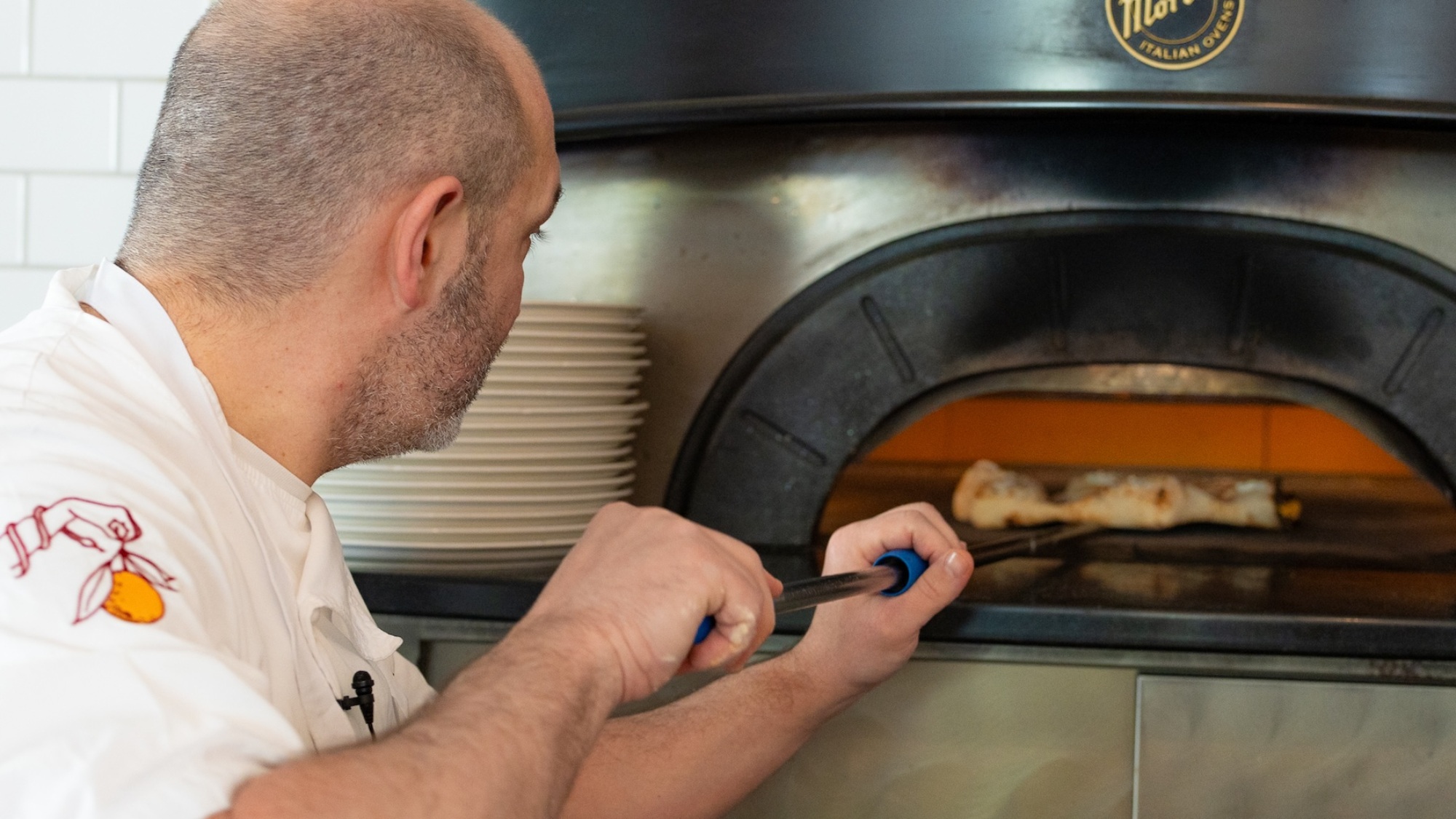 Like a traditional Neapolitan oven, Cicala’s electric Neapolis has a lower, shorter door, or dome, and works like a deck oven. He sets the temperature to 485 degrees Celsius (that’s 905 degrees Fahrenheit) and begins to build the Stella.