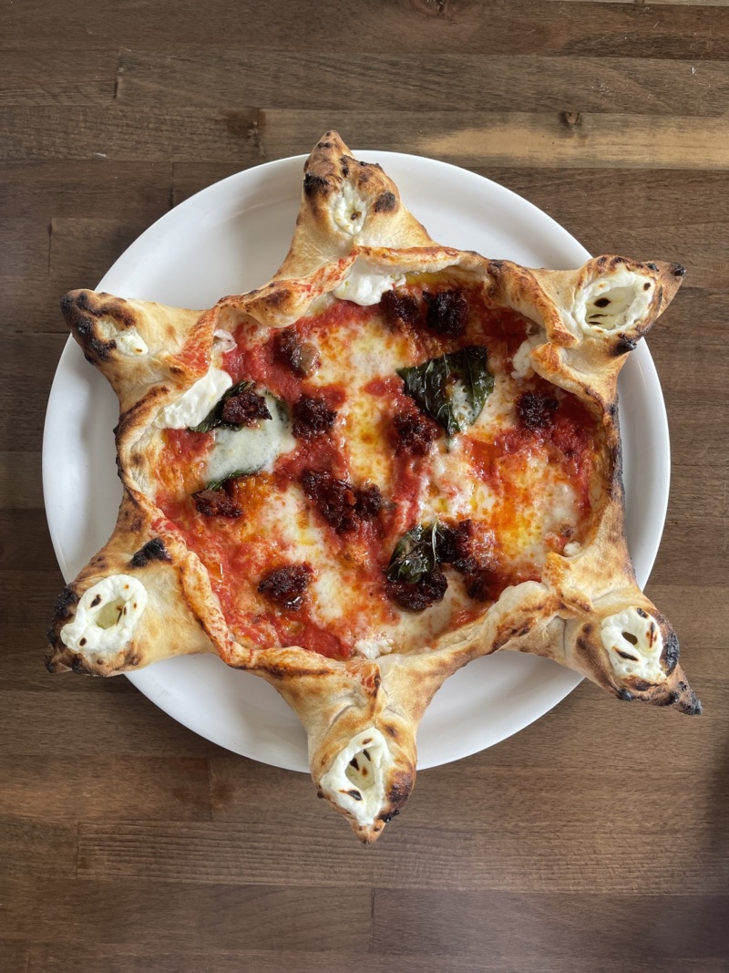 About two minutes later, the star tips have puffed up, the ricotta cheese is slightly gooey, those signature “leopard spots” cover each point, and the tomato sauce and cheese have merged with the ‘nduja in between. Cicala drizzles on extra virgin olive oil before plating the pie and serving it whole.