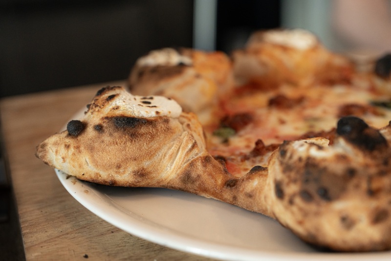 Neapolitan-style pizza dough is typically hydrated to somewhere between 60% and 70%. Cicala opts for the high end of that range, even though it requires more careful handling. “You get a lighter, fluffier, slightly crispier crust, which I think is great for the Stella because it’s such a rich pizza,” adds Cicala. He also cites the “canotto” crust of Neapolitan pizza as a quintessential characteristic — the airy, puffed-up crust edge that looks “inflated like an inner tube.”
