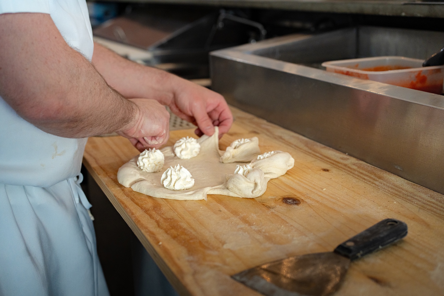 Cicala shapes the dough into a round, 12-inch size using the slap method before making five slits (picture 12, 10, six, four, and two on a clock) which will become the star points. “I like to have the fancy shape exposed for each of the points.” Then he pipes on fresh ricotta in between each slit, pulls the dough to wrap around the cheese, and pinches it together.