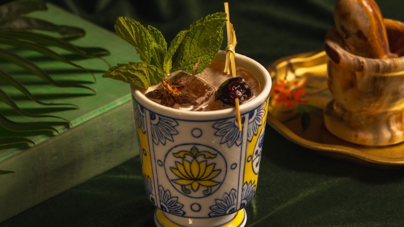 At this innovative Indian restaurant, non-alcoholic cocktails receive particular attention. This rich sipper (with a name translating from Hindi as “Hey, Date”) centers salted date syrup, along with a smoky zero-proof agave spirit and zero-proof coffee liqueur, finished with Coca-Cola. The complex end result is somewhere between a batanga (typically made with Tequila, lime juice, and Mexican Coke) and an espresso martini, with a luxuriously foamy head. Another attraction on the menu: A trio of half-size sippers based on Adda’s housemade mint, tamarind, and mango pickle chutneys.