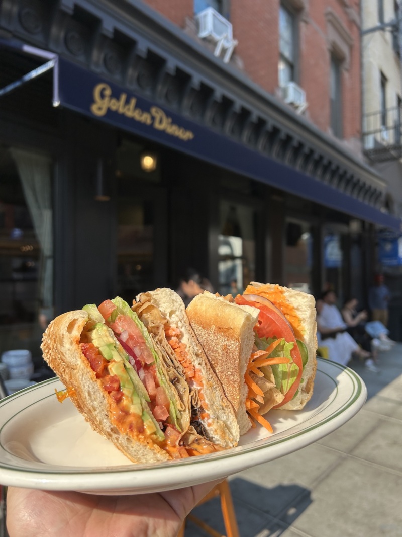 You might head to Golden Diner for the saucer-like pancakes served morning, noon, and night, but you’ll need something savory on the side, and the sandwich menu offers excellent options. The Vegetalian Hero will satisfy every vegetarian’s (and yes, even omnivore’s) hankering for a classic NYC deli sandwich. The bologna-like bite comes from yuba (tofu skin) marinated in Italian dressing. The sandwich is finished with a hot pickled cherry pepper sauce and a creamy spread to balance some of the heat, served on a sesame hero from Parisi Bakery around the corner on Mott Street.