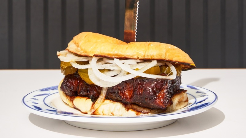 Bonnie’s serves intensely flavorful Cantonese American dishes with a hint of whimsy, and the ever-popular BkRib is a great example of chef and owner Calvin Eng’s playful culinary approach. His over-the-top (in the best way possible) take on the familiar fast food order features steamed, boneless spareribs coated in a sweet and savory glaze on a sesame-topped milk bun with piquant Chinese mustard and plenty of bread and butter pickles.