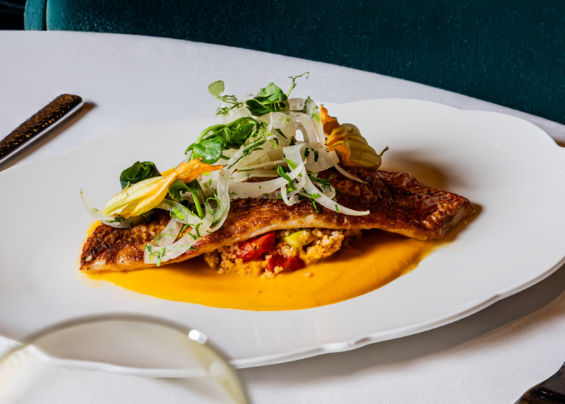 This light and vibrant seafood dish exemplifies Daniel’s commitment to Florida’s fishermen. “One of our objectives is to highlight the dedication of our ranchers, farmers, and fishermen in Florida,” Ganem says. The Florida Keys red snapper has become a staple on the menu for that reason, and it’s paired with fresh Sun Gold tomatoes, yellow bell peppers, zucchini, fennel, and a refreshing couscous-vegetable medley.