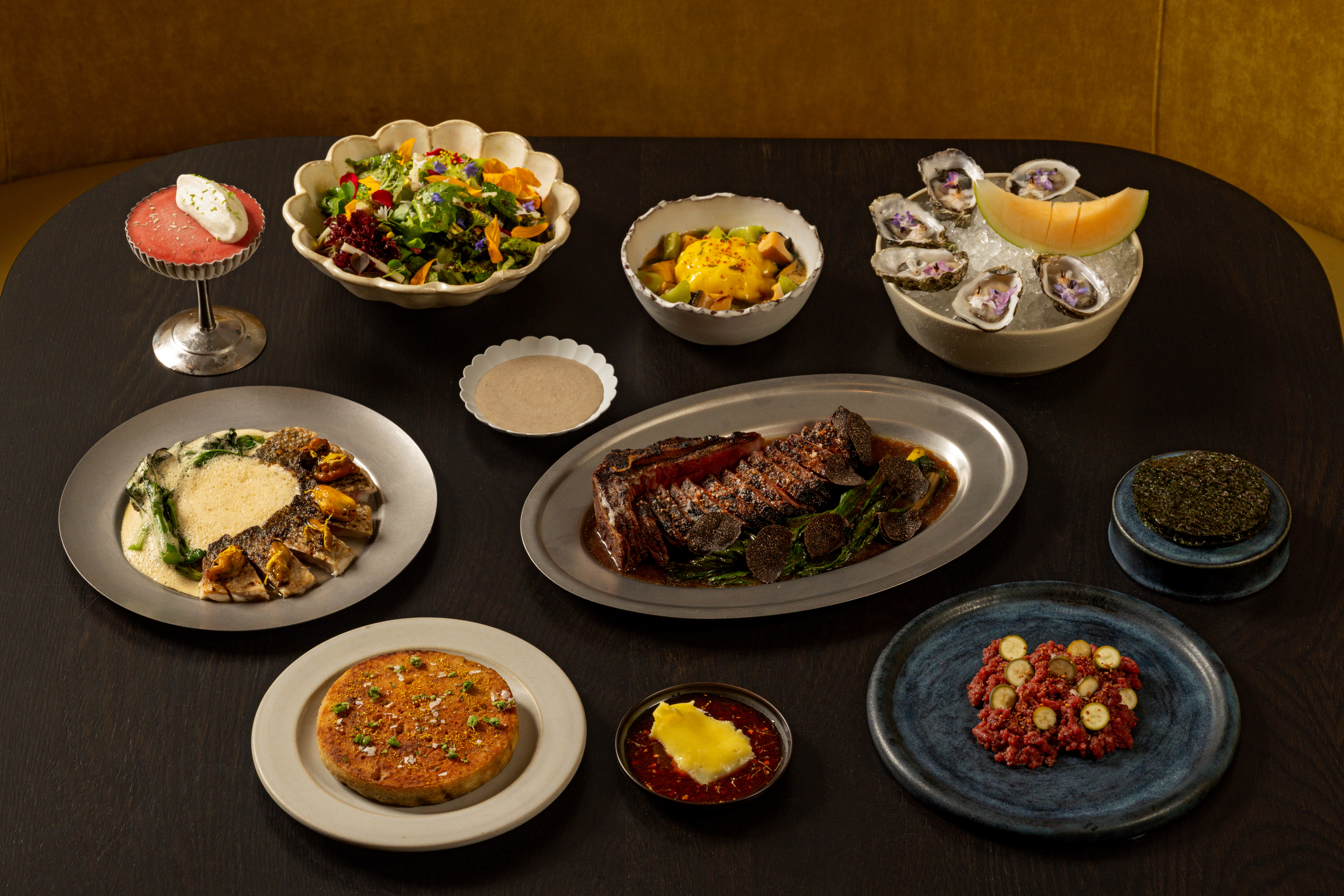 Getting to know Los Angeles for Brock has resulted in a menu that’s soaked in sun and seaspray, all cooked over an open fire. Dishes like the tomato and stone fruit salad, dressed in tomato water infused with seaweed, screams Santa Monica farmers’ market. Local abalone and celtuce swim in a loose Koshihikari rice stew, a standout dish that in no way tastes of gumbo but nevertheless brings it to mind. The deer tartare, studded with pickled zucchini “cornichons” and offered up with a briny sheet of nori brings with it the sort of fun deliciousness that comes from a chef enthusiastically playing in a new sandbox. Oysters, too, are served alongside a big, juicy slice of Weiser Farms melon.