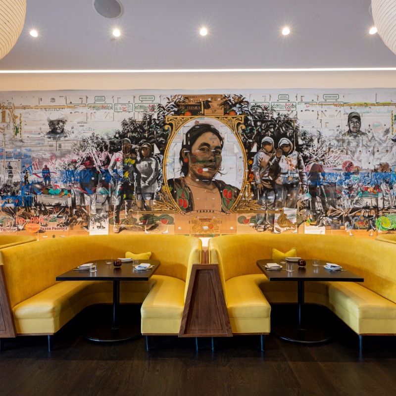 Having a DJ and music as such an intrinsic part of the Darling experience creates a vibe that makes the space feel like a slow rolling party as much as it does a restaurant (without it veering into clubstaurant territory, thankfully). That said, thoughtful food and a focus on design still reign supreme. This is clear in the centerpiece artwork, a 23-foot mural created by artist Narsiso Martinez, titled “Legal Tender.” A piece created out of tens of flattened produce boxes, it’s painted with the scenes and faces of the undocumented Mexican workers now so at risk in a pattern that closely resembles the American dollar bill. The striking piece implores the viewer to question where their food really comes from and at what cost.