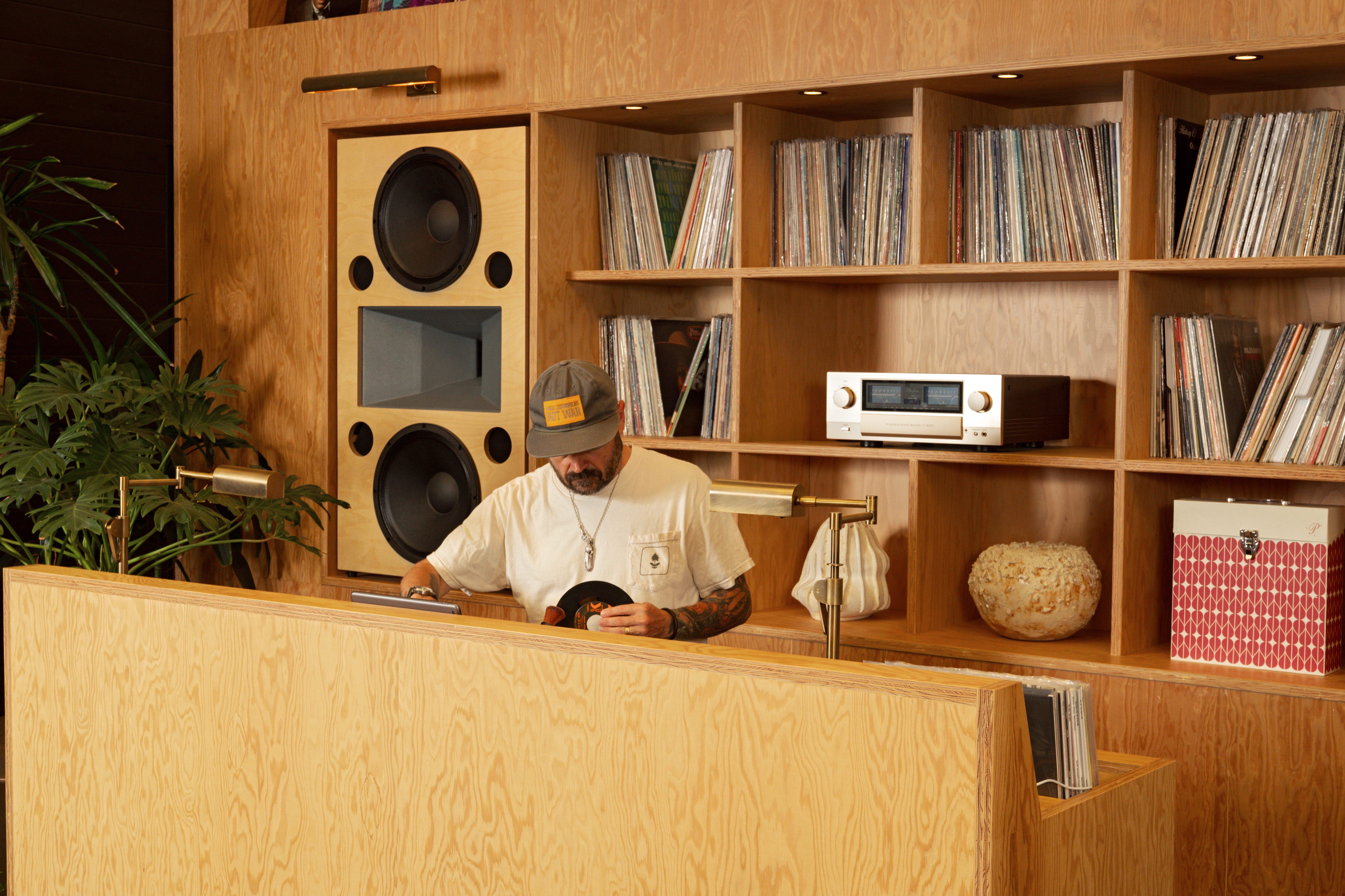 Not just a restaurant, Darling is equal parts listening bar, inspired by Brock’s intense love of all things music, so much that the space boasts large swaths of Brock’s impressive personal collection. The DJ booth serves as the heart of the room, a beating box encased in blonde birch wood, bookended by floorstanding speakers that were specially designed by Darling’s music director, MaxV.