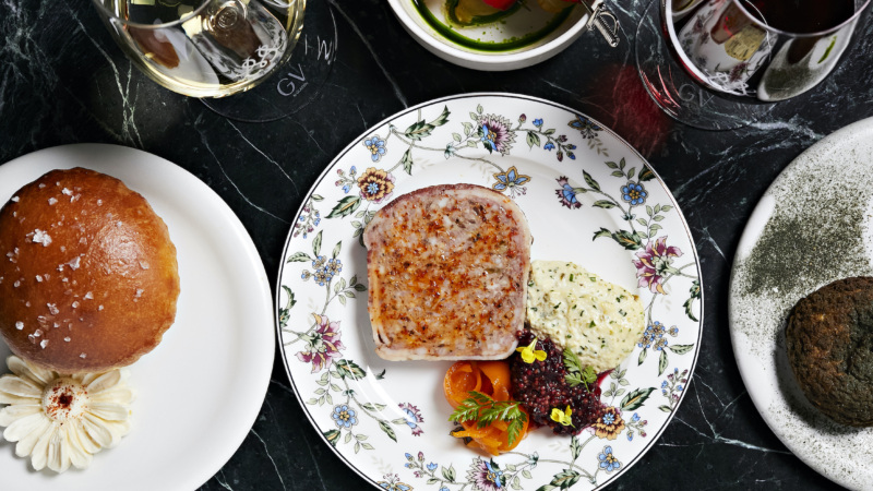Smoked eel croquettes with béchamel sauce; green garlic brioche-stuffed roast chicken; choux buns with housemade coconut ice cream. -
