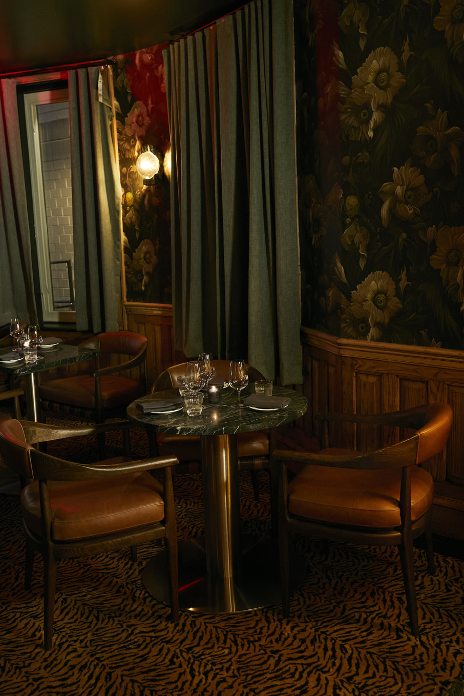 Inside, the aesthetic draws on an Art Deco-accented kaleidoscope — green marble tabletops offset a tiger-striped carpet and elaborate wooden fireplaces, while chrome fixtures pop against dark floral wallpaper and warm leather banquettes. The shotgun-style layout rolls from a casual front bar area into the former tenant’s original 12-seat bar, an expanse of dark marble glowing beneath vintage pendant lights as an eye-catching silver paneled ceiling curves into an illuminated backbar. It all ends in an inviting rear dining room decked out in its own maximalist charm.