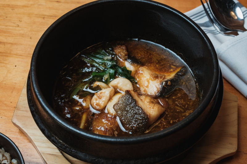 That shows up in dishes like inihaw na talong, roasted Chinese eggplants smeared with sunflower seed butter and a pickled tomato salad. Also in the Mindanao-inspired maitake piaparan, where Fontelera swaps the traditional chicken or goat meat for maitake mushrooms, stewed in a creamy coconut milk sauce seasoned with shio koji and palapa.