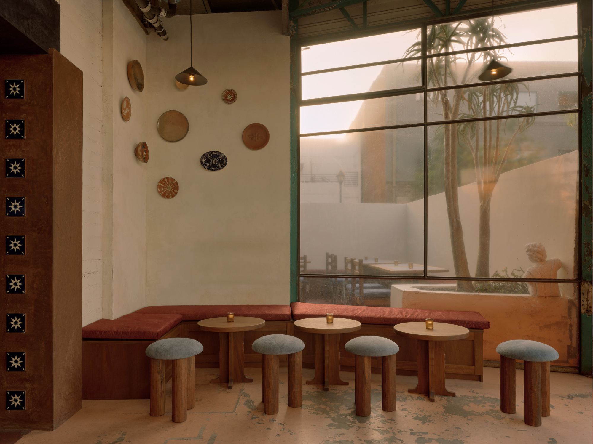 A loungey cafe area lined with cushioned banquettes, upholstered velvet stools, and small circular tables greets guests as they enter the T-shaped space, followed by multiple seating areas both inside and out. Original details like exposed ceilings and painted brick from previous tenants remain, alongside new touches, including red plaster, conical steel pendants, and a dark wooden bar. Custom furniture from OMBIA Studio (all handcrafted in Mexico) include wooden tables and chairs, tie-on cushions, and built-in bottle holders. The Mexican ceramics dotting the space are courtesy of Isabella Marengo of Bugambilia, alternating with artwork on the walls from the owner’s own private collection.