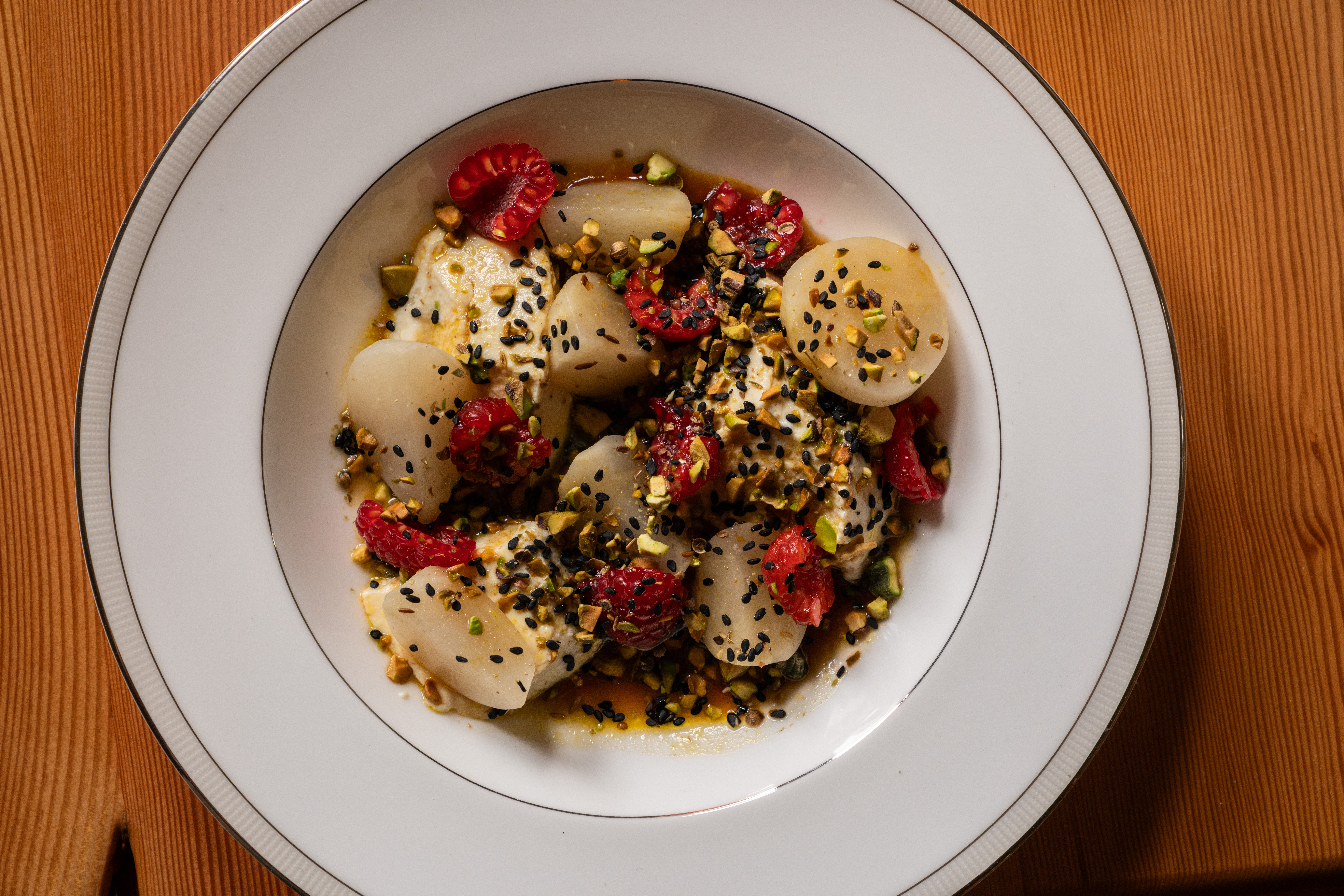 I’d do the bread course, and as a curve ball, add on the fennel Caesar — it’s got radish, jicama, sultanas that are plumped back up in jasmine tea, an anchovy Caesar dressing, and bread crumbs from the onion bread. And then, it’s really hard to decide between the two protein-forward dishes. The squid stuffed with luxury rice is a little richer as a risotto-style dish. If I were there for a light dinner, I would do the Spanish mackerel, which is a really delicate and beautiful dish. For dessert, the pinenut cookies are wonderful.