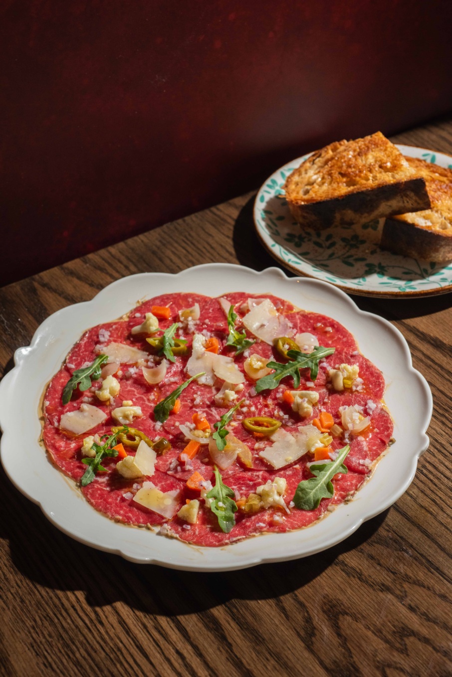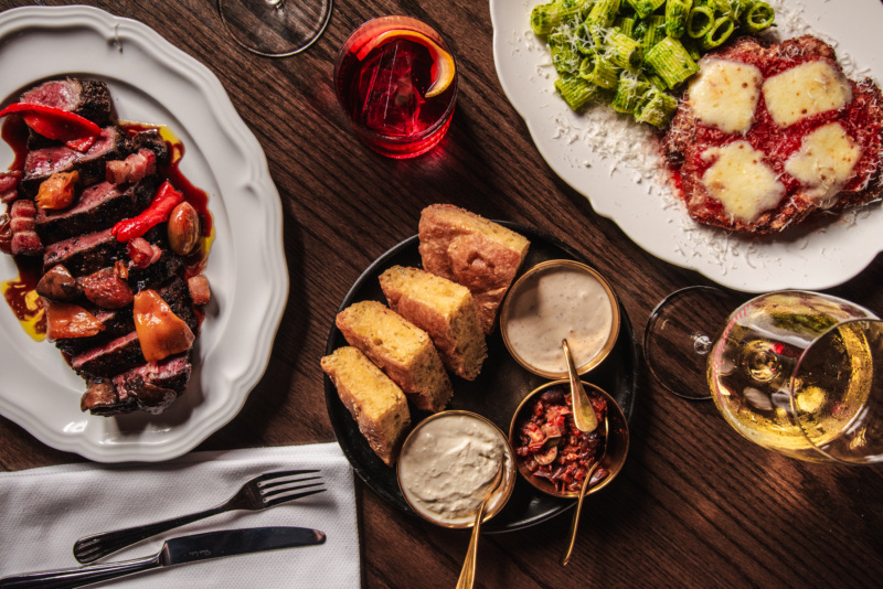 While the menu is full of nostalgic comfort food classics like baked clams casino, spicy vodka stuffed shells, and eggplant parmesan, Eckfeld still shows off the occasional fine dining flex too, like an Italian beef-inspired carpaccio with giardiniera, parmesan and beef jus aioli.