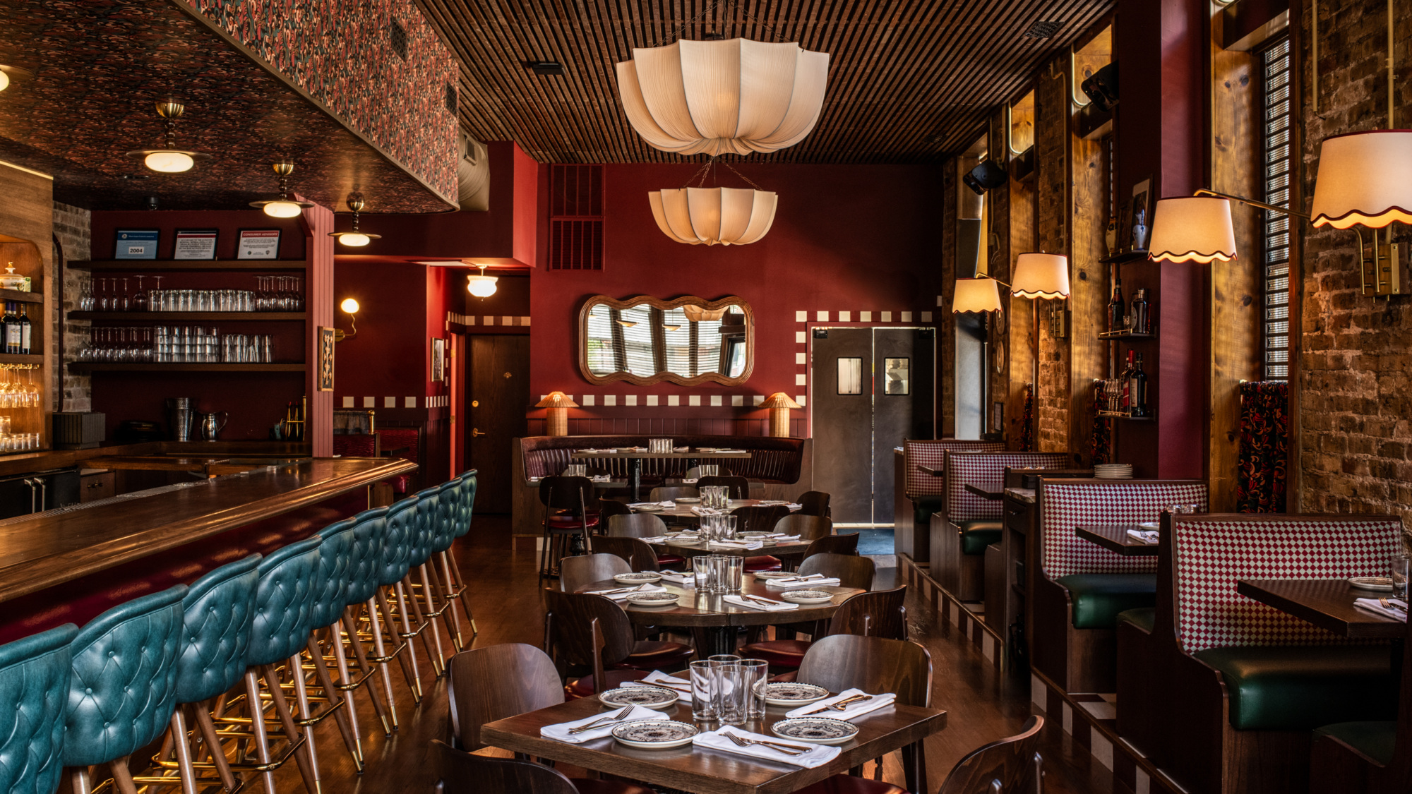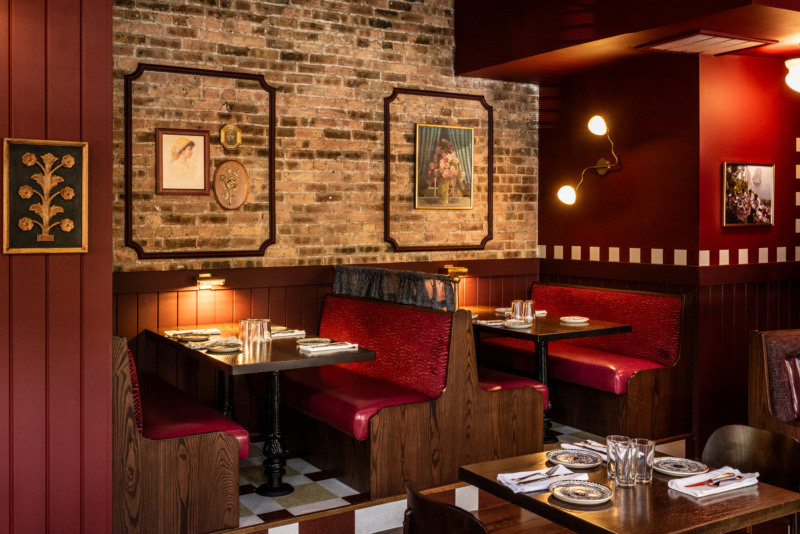 Chicago’s Siren Betty Design redid the interiors, with Dimmi Dimmi’s fictional muse, a kooky nonna, in mind. The 78-seat restaurant is meant to reflect the eclectic taste and warm hospitality of a vivacious art-loving grandma, with bold colors, textured finishes, and hand-painted checkerboard trim by Susan Williams. The colorful space is layered with local art, including Chicago artist Natalie Osbourne’s vibrant semi-abstract portrait of Nonna to capture her eccentricity and charm, and a bar-height centerpiece table by local woodworker Navillus Woodworks.