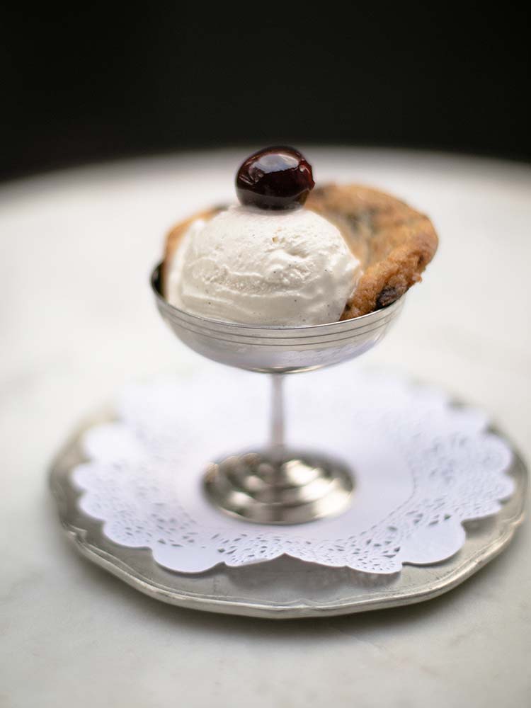 Nods to the bakery appear throughout the menu, and not just in the desserts. Yes, there is a tahini chocolate chip cookie sundae to finish, but there is also a kabocha custard tart with a flaky crust and 4F sourdough served with tinned fish.
