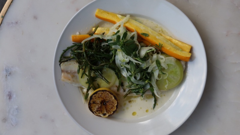 These include branzino en papillote with sea beans, preserved lemon, fennel salad, and summer squash, and pork tenderloin, with a Gingergold apple Calabrian chile jam and haricot vert in mint pistou.