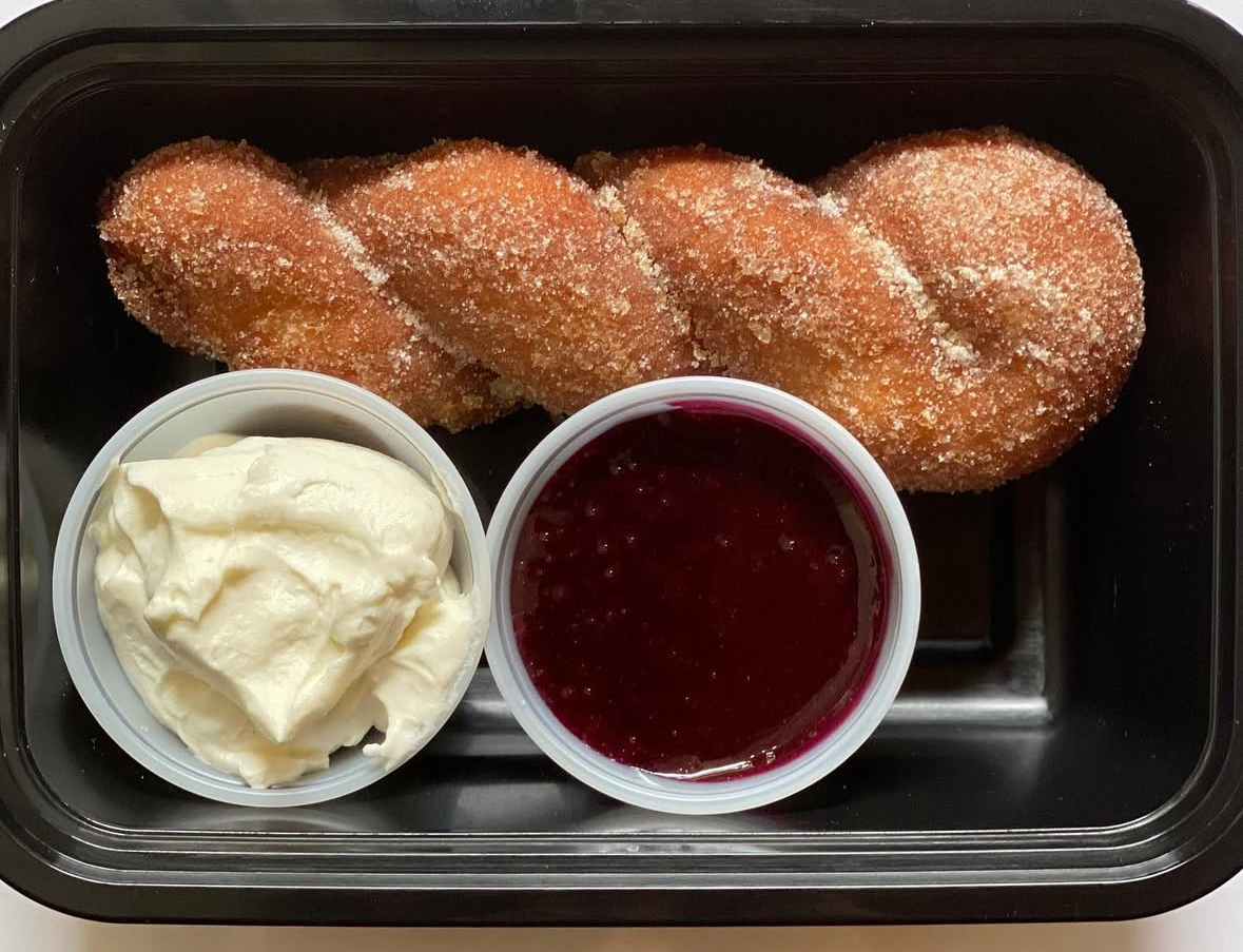 These popular Korean twisted donuts are a mainstay at Korean bakeries, but are usually baked in the morning and then served ready-made from the shelf. Lee wanted to fry them to order to produce a fresh and airy hot dessert. They use a two-day fermented dough, shape them, and then let them prove and rest until they’re ready to fry. The flavor combinations change seasonally, and for the colder months, they’re tossing the kkwabaegi in a spiced sugar mix with cinnamon, nutmeg, star anise, and cloves. The donuts are served with a persimmon curd and Korean citrus tea marmalade made from yuja.