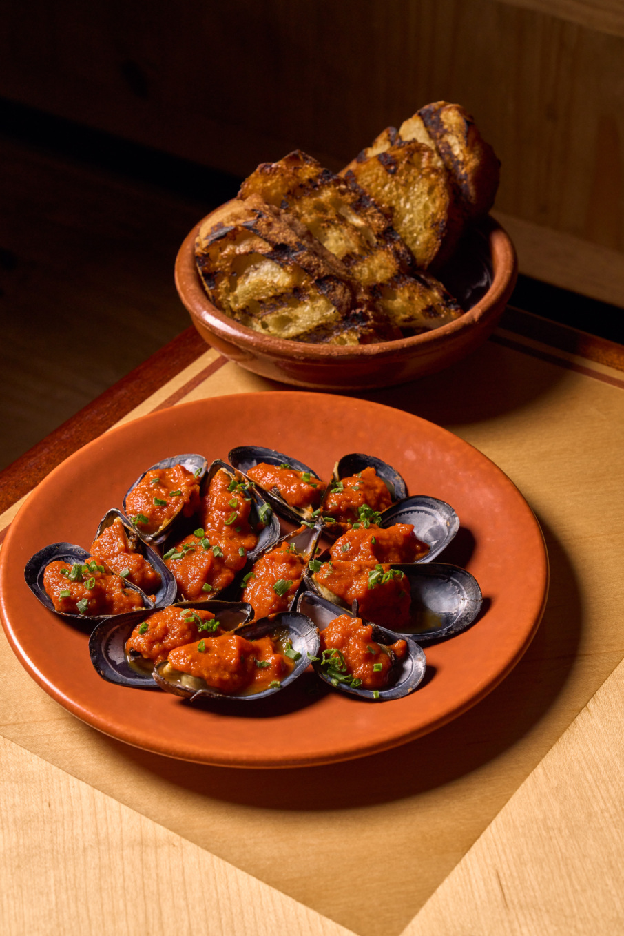 Hudnall says this is one of the dishes that best represents the restaurant’s new menu. Each mussel is steamed and plated open-faced with a spoonful of sofrito instead of served by the bowl. The base takes time: peppers are roasted until dark, onions caramelized for sweetness, and garlic is confited slowly to pull out depth.