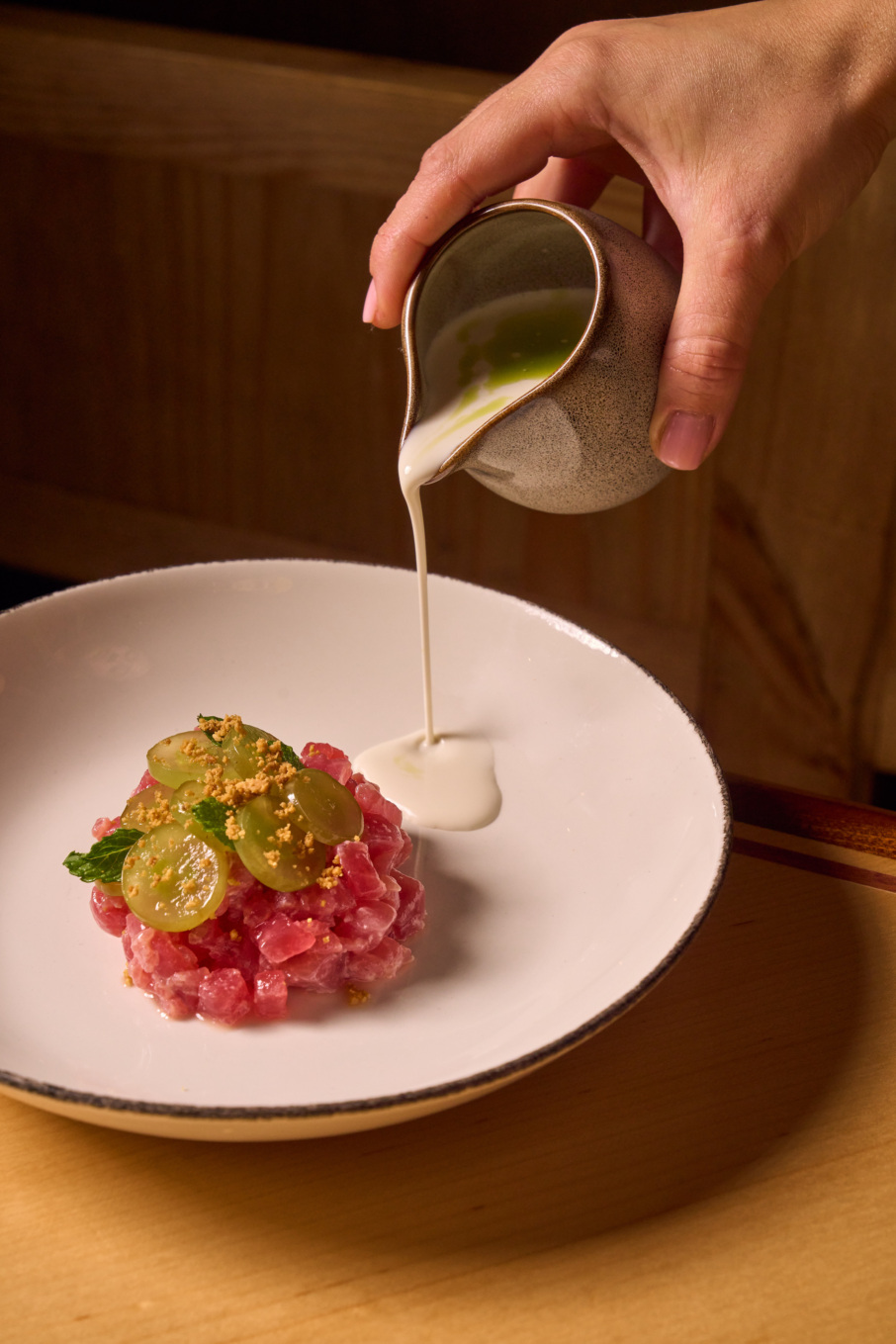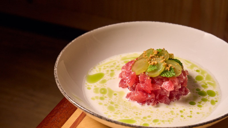 This dish evolved from an earlier version on Tropezón’s menu. “The tuna crudo is ajo blanco,” said Lebron. “Traditionally, it’s an almond and garlic sauce, but we wanted to put that Miami touch on it, so that’s where the coconut ajo blanco came in.” He tops it with pickled grapes and mint oil, a take that keeps its Andalusian foundation while feeling more in line with Miami’s climate.