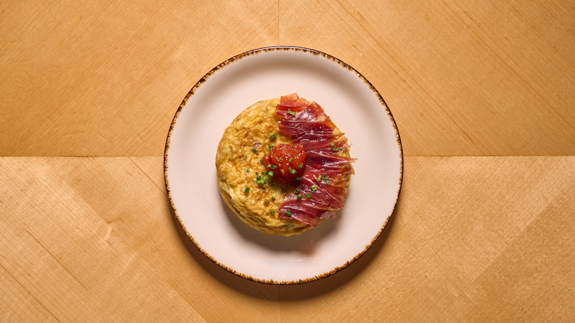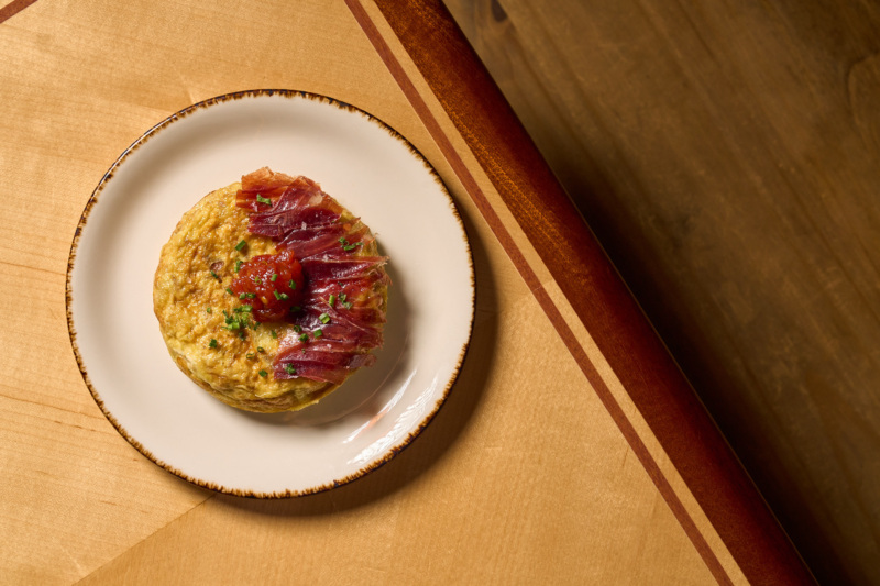 Housemade potato chips replace the usual thinly sliced potatoes, creating light layers throughout the egg mixture. The result is sweet from caramelized onion, rich from jamón, and balanced by the slight acidity of tomato jam.