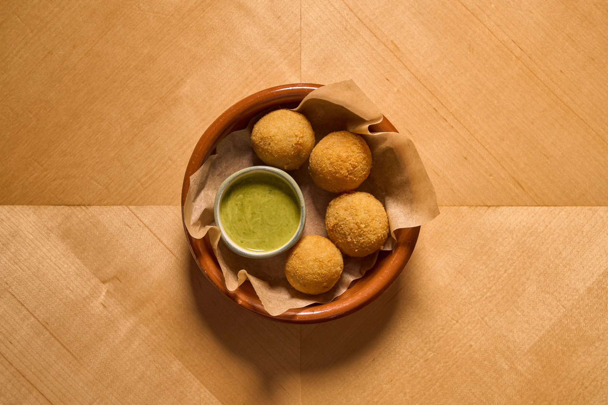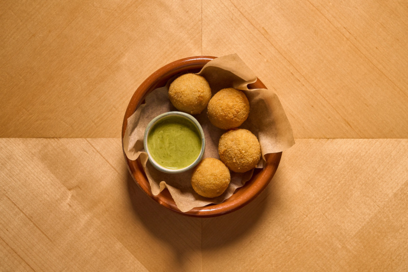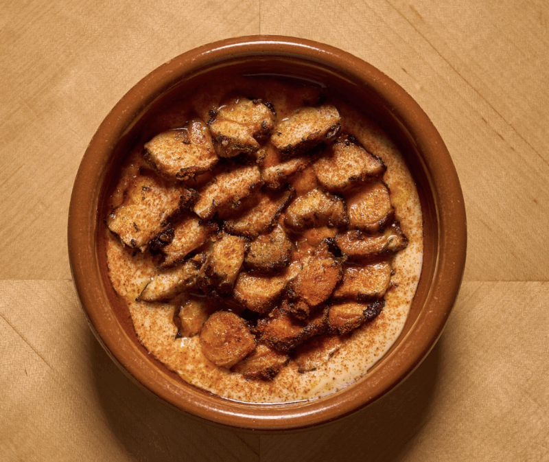 He reworked that pairing into croquetas filled with sobrasada, manchego, and chorizo, a mix that gives each bite a slow-building depth. The filling starts with the sausage cooked down like chorizo, then blended into a béchamel before being breaded and fried to order. The result is crisp and golden on the outside, creamy and peppery inside. A streak of mojo verde finishes the dish and helps cut through the fat with acidity and bright herbs.