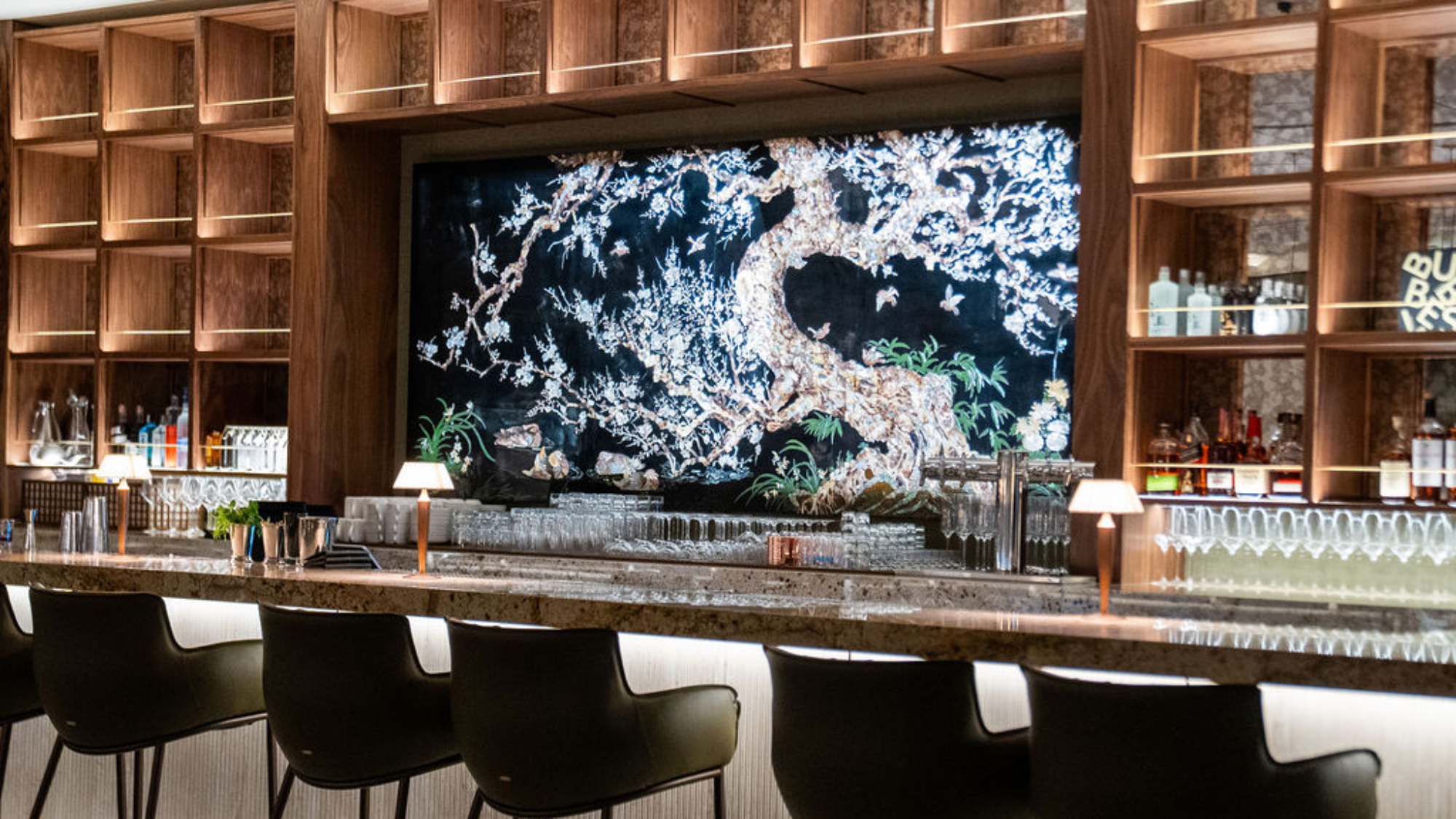 As such, marble, walnut, and brass fixtures reign supreme at Ingle, with earthy tones reflecting the earthiness of the menu itself. And at the center of the entire restaurant, you’ll find a stunning mother of pearl art piece at the bar. “This is actually my grandmother’s closet that we had imported from Korea and reimagined,” Jang says.