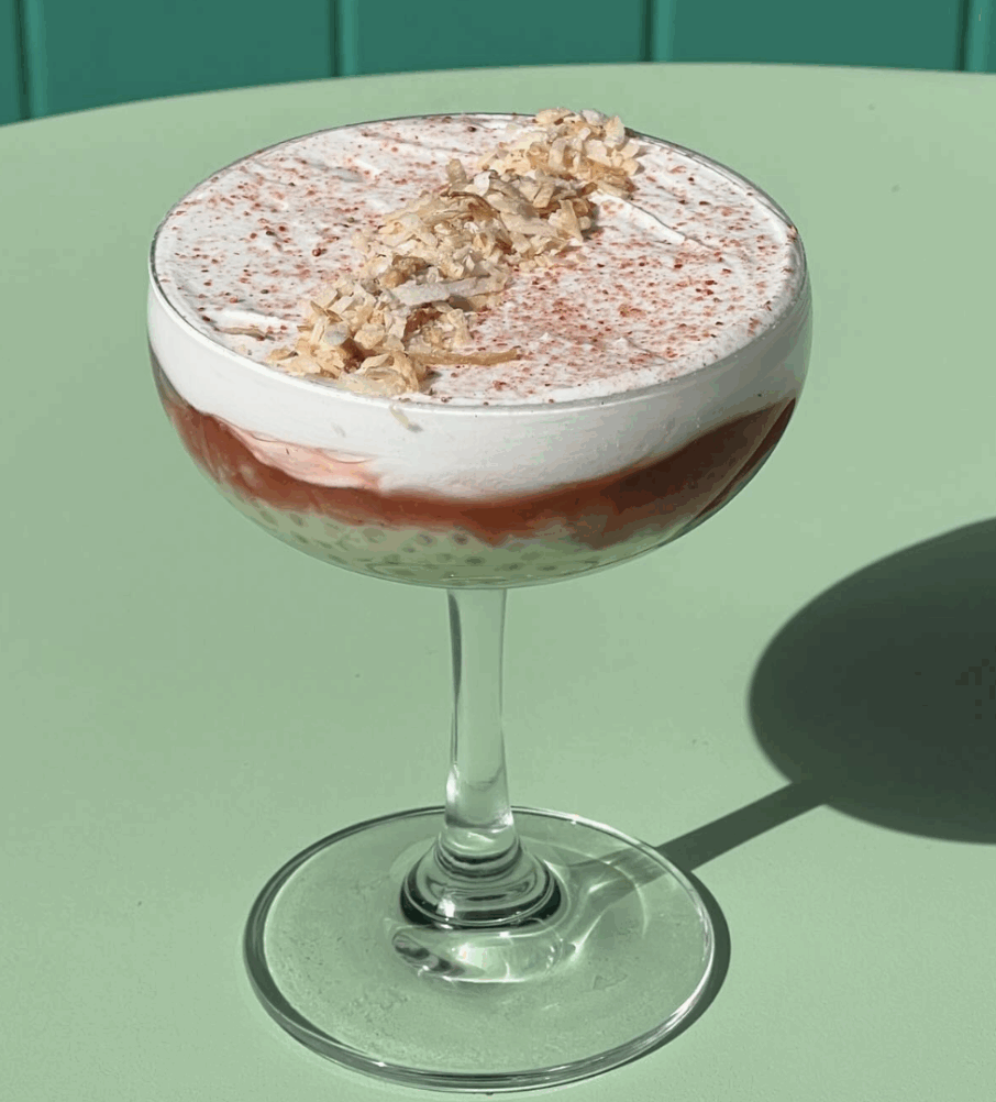 As our dinner entered its last act, we ordered the halo halo, layered with leche flan, coffee jelly, tapioca pearls, coffee milk, and pinipig granola. The pandan sago also caught our eye. Elegantly presented in a coupe glass like a trifle, the pudding-like dessert’s bottom layer is dyed a playful green from the pandan, and dotted with tapioca pearls. Above that was a rich layer of jammy cooked strawberries, and a luscious dollop of coconut whip topped with toasted coconut.