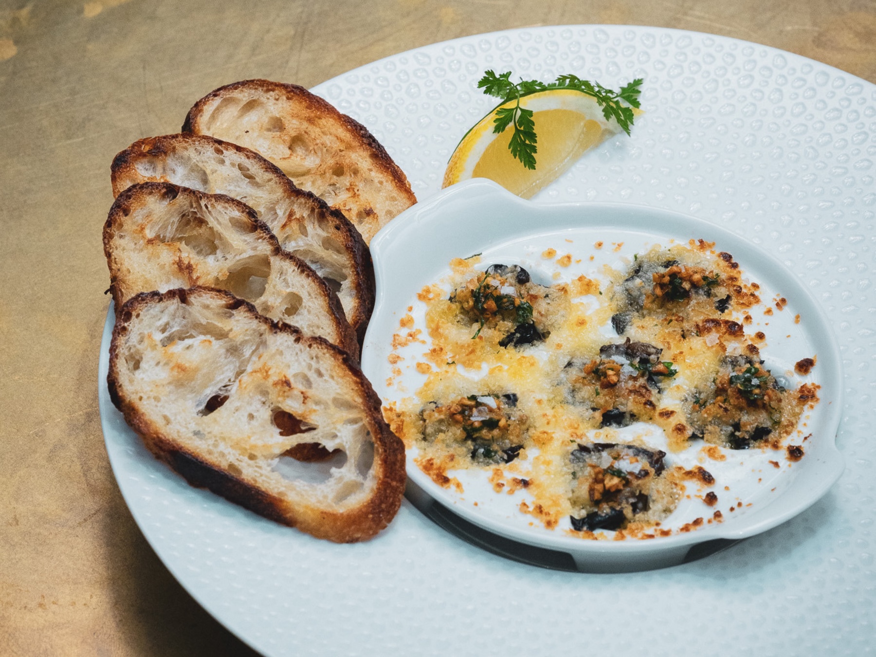 Housemade bread and butters; escargot; and mushroom paella. -