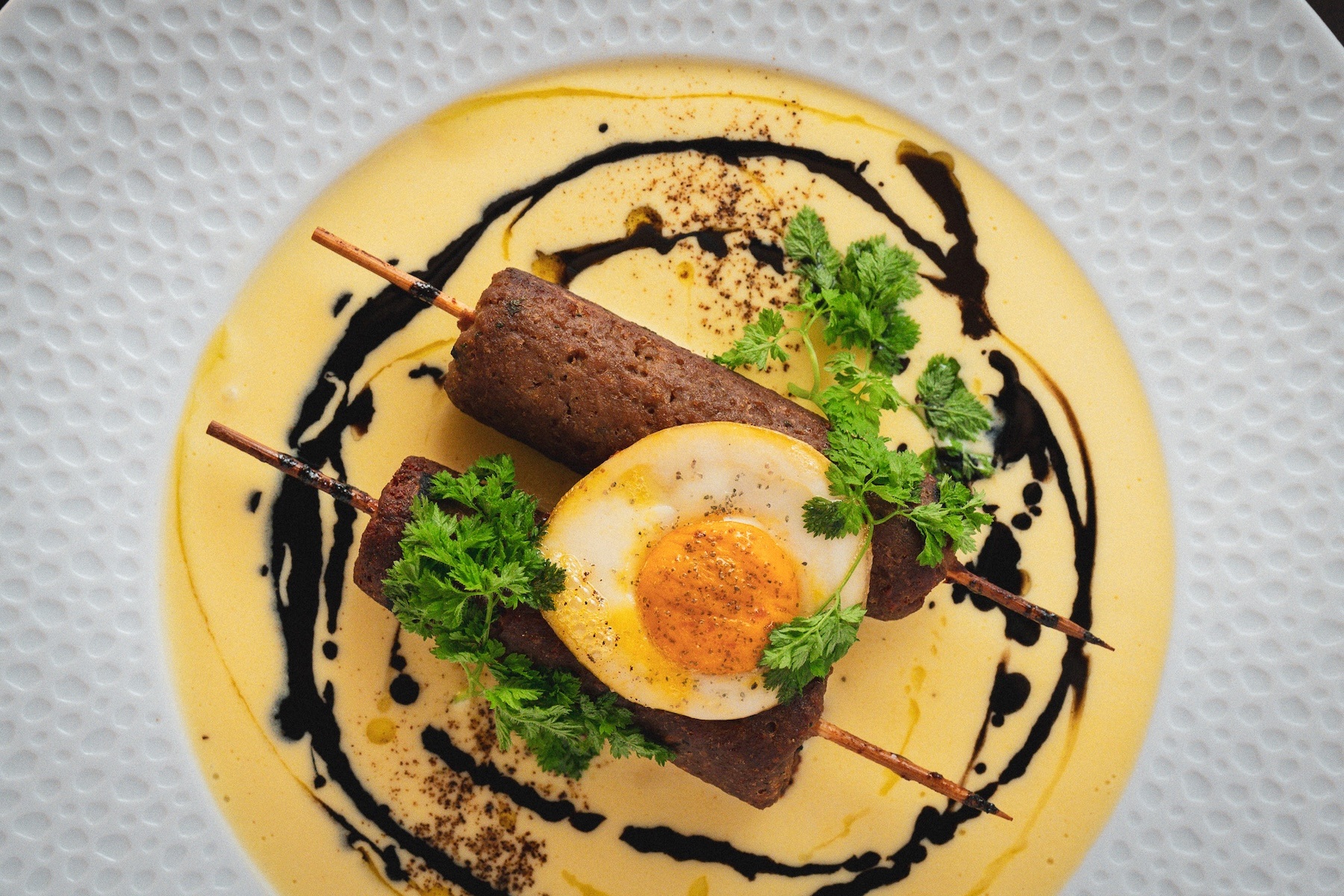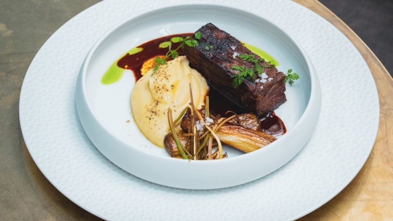 The dish Vaknin calls out is the truffle beef, which is made from a base of Impossible meat, prepared in a black garlic lemon sauce. “We grill that on a bed of truffled goat cheese puree with a quail egg on top, and all that is plant-based,” he says. The quail egg is custom-made for the restaurant by a company called Yo Egg. “And, we have burnt shallot skin oil with red wine vinegar that cuts through all that richness from the truffled goat cheese.