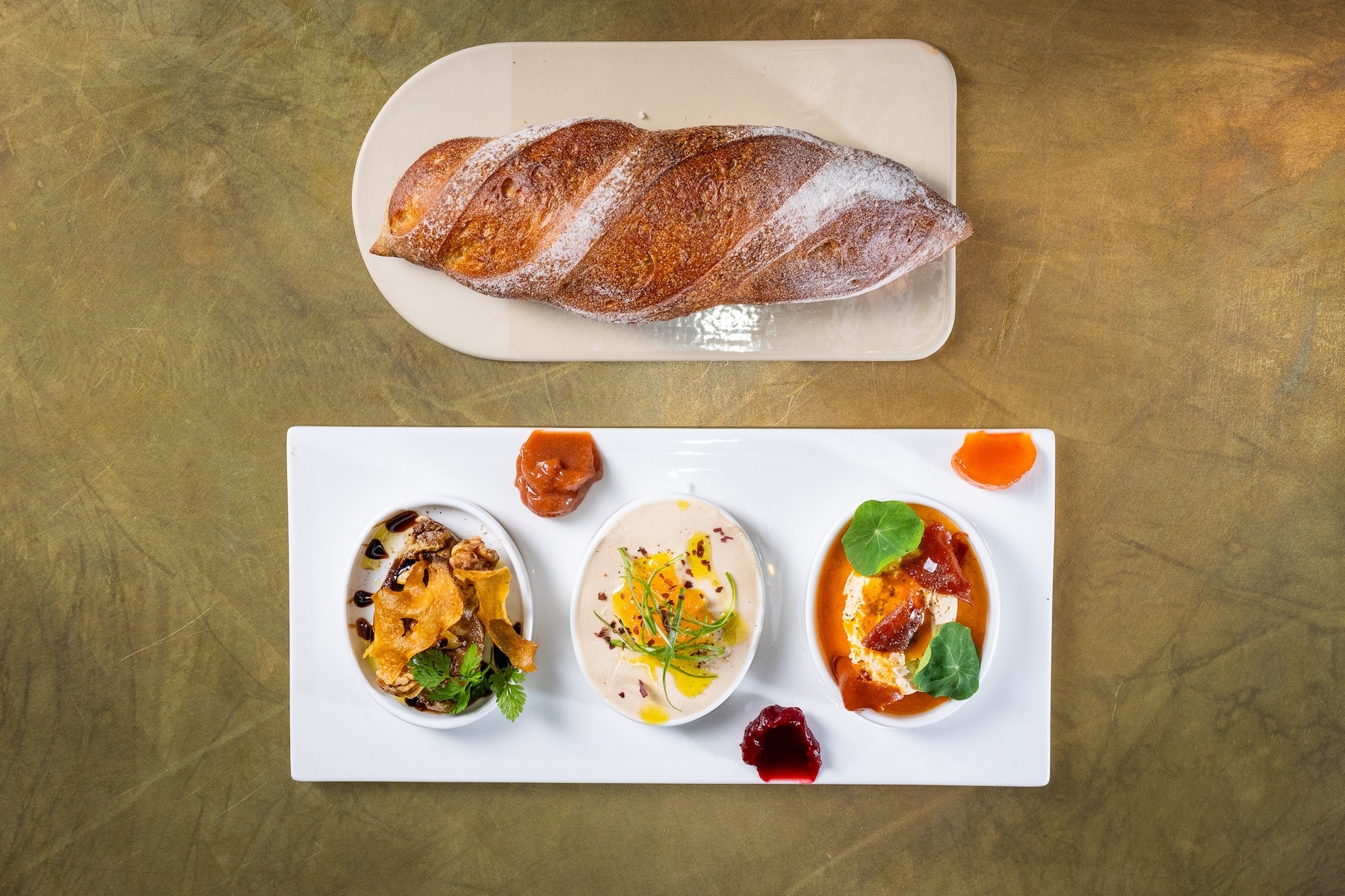 ‘We have our own bakery, so we make all the breads in all our restaurants,” Vaknin says. “We start with a sourdough that is made in-house and has been going with a starter for the past two-and-a-half years. We have our demi French baguette and our brioche … and we make our own butters as well … [one with] with dehydrated olive and caramel, and [another with] thyme and confit garlic. I think that doing the fundamentals in a restaurant is extremely important, and that was one of them.”