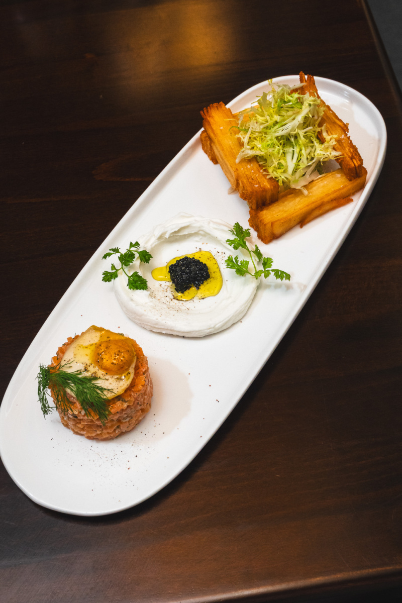 “It’s done with extra virgin olive oil, capers, dill, shallots, and grain mustard — a French mustard that we mix together,” Vaknin says. “It’s all chopped together and sits on a potato pavé, which is layered potatoes that we crisp up in the fryer, and on top of that, we have our aged balsamic and fresh dill and a little bit of seaweed caviar.”