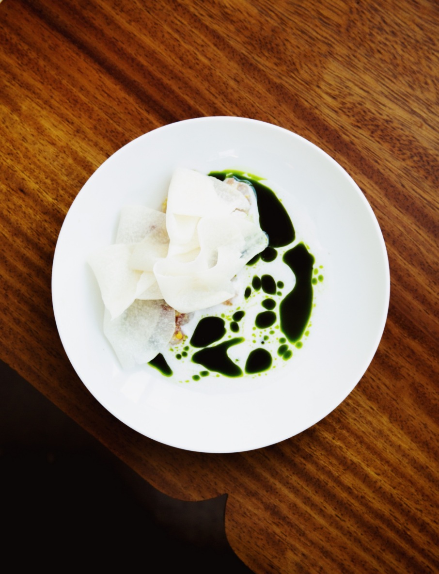 The menu is also a true collaboration. Guillermo Mendez, Sqirl’s executive sous chef who is running dinner service, brings Mexican flavors to mains like pork collar with sikil p’ak, tamarindo, purslane, chicory, and Sonoran tortilla. The wagyu Denver with sauce vert, braised cipollini and a tabbouleh mignonette comes from “wizard” chef de cuisine Sandra Felix. “We have the framework of what Sqirl is—fermentation, California-forward—but my palate isn’t the only one that matters,” Koslow says.