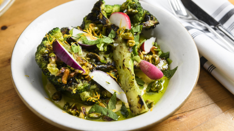 Our favorite vegan dishes: Wood-grilled broccoli, beet salad, and spice-roasted cauliflower.