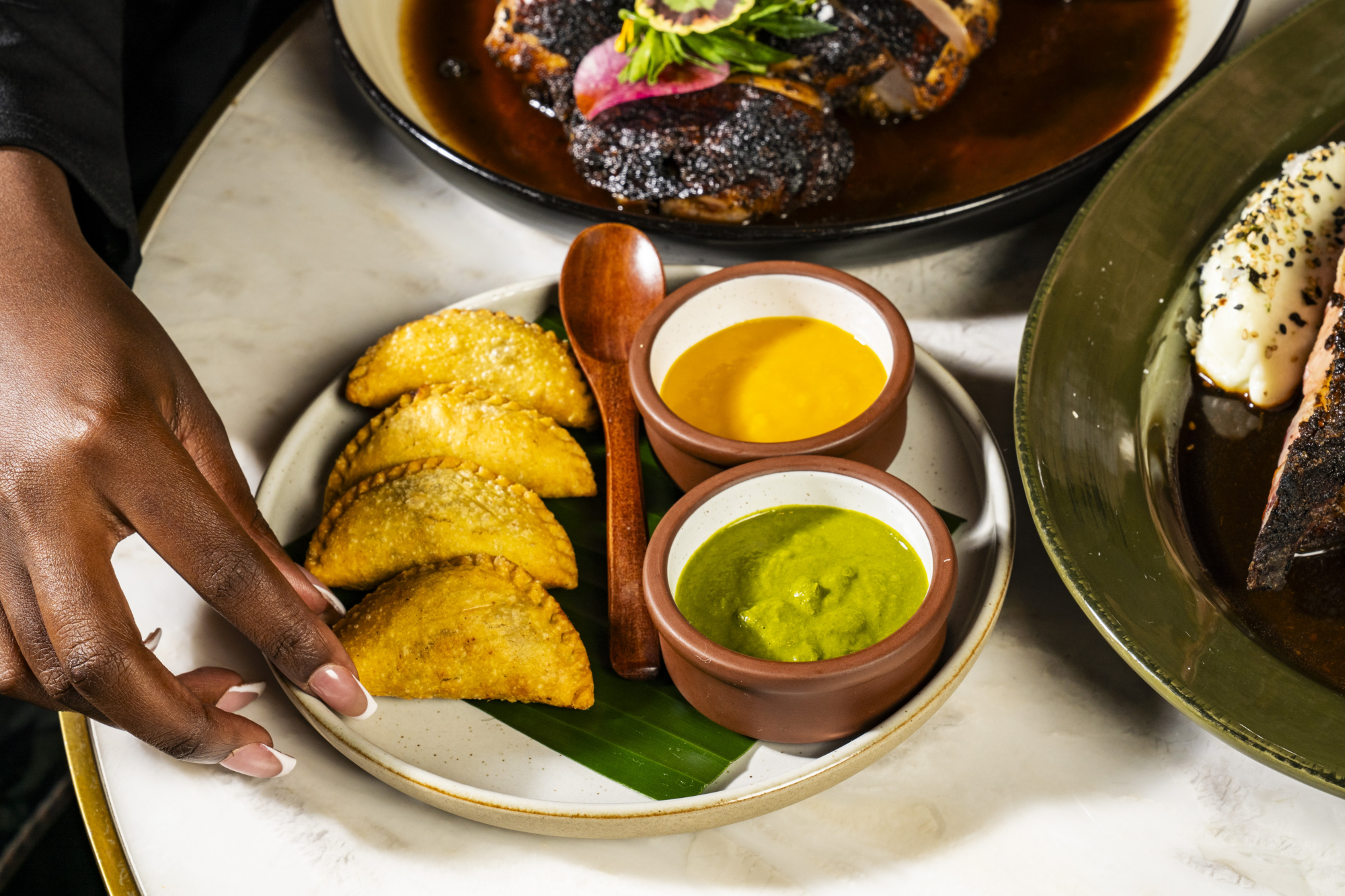 I would start with the plantains and expressions. It’s a sweet, light introduction to the meal, and plantains are really popular in the Caribbean, so it gives you a good sense of what you’re about to get into. Then I’d move to the patties. We have a beef patty and an aloo patty, which is vegetarian, and both are fantastic. I would get both. Next, I’d do the island milk and gold crudo. It’s raw avocado with marinated mango, coconut sauce, and cashews. It’s light, refreshing, and not overwhelming, just a really delicious teaser that won’t put you off your entrée.