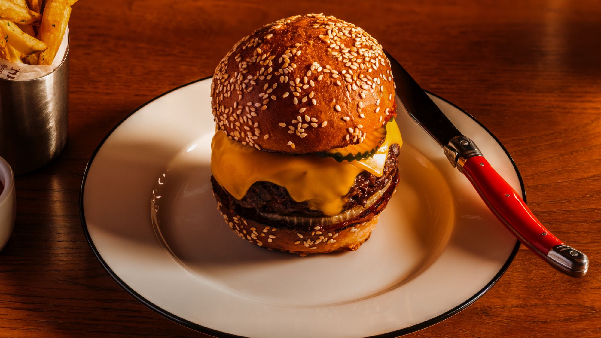 Over the last decade or so, however, a different style of burger took over the city: the smash burger. For a time, it seemed every new shop in L.A. was slinging a thin, crispy patty that leaned all the way into the Maillard reaction. And, for a time, we loved it. But now, the pendulum is swinging back. To stand out in a sea of smash, you have to build up. Go thick. In other words, the bar burger (also known as a bistro burger) is making a comeback.