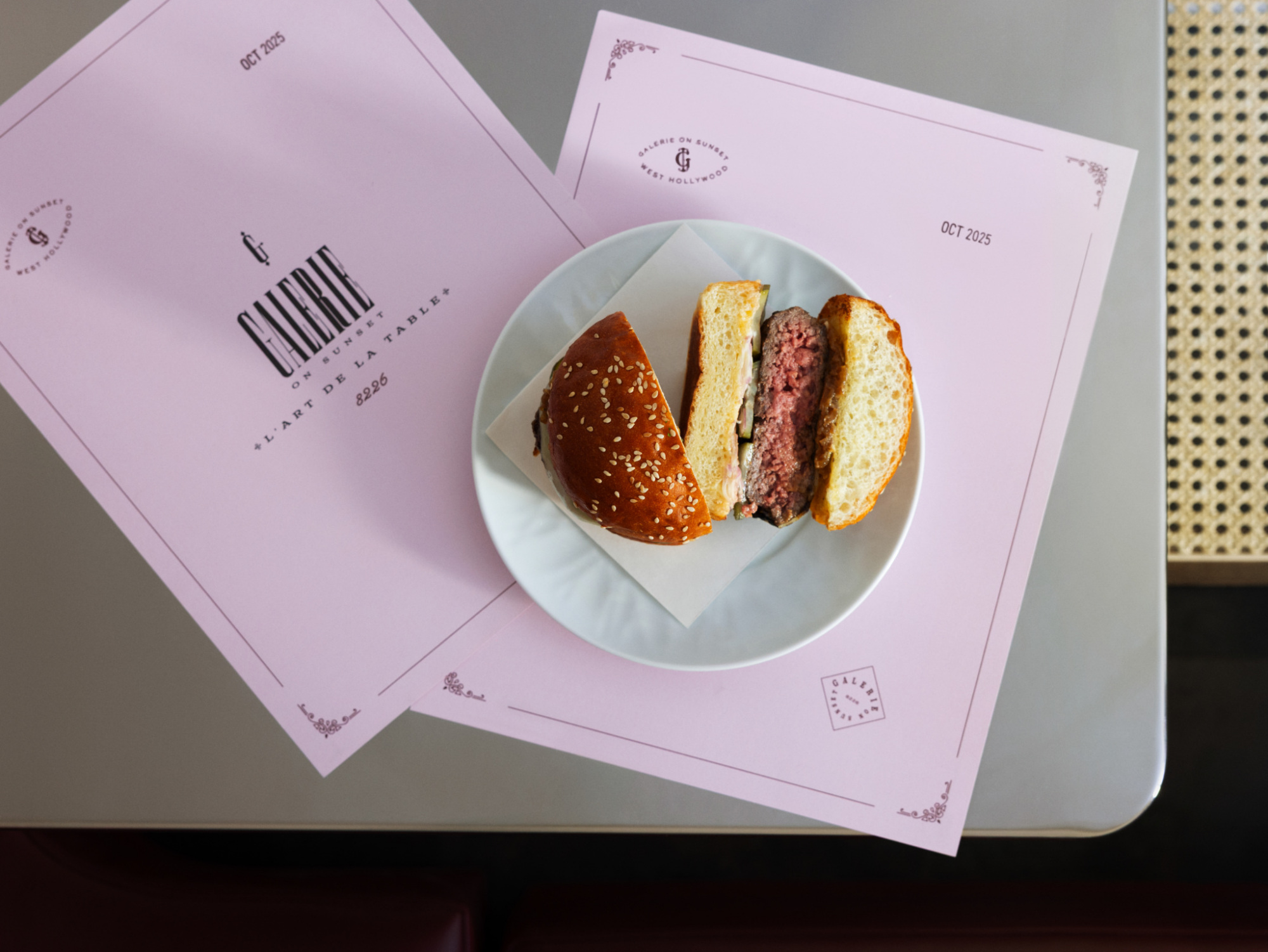 Over at Galerie on Sunset, chef Gabriel Lindsey’s burger evokes a Parisian bistro. The patty is made of ground beef shoulder, topped with a burger sauce meant to taste like French onion soup (it uses caramelized onion, beef stock, Worcestershire, roasted garlic, and fermented black garlic). “With a smash burger, the appeal is that intense crust-to-meat ratio and a quick, high-heat cook,” says Lindsey. “A bistro-style burger is a slower, more intentional moment at the table.”