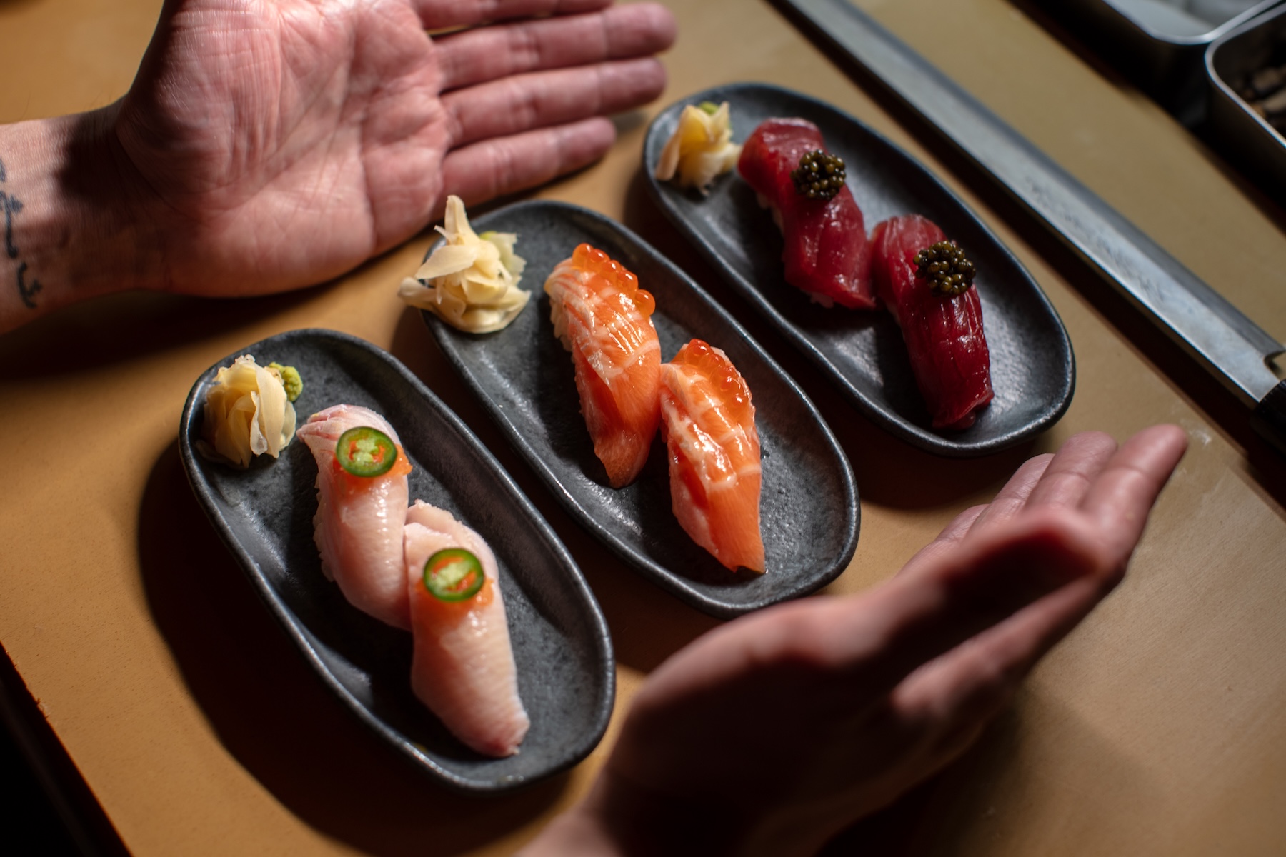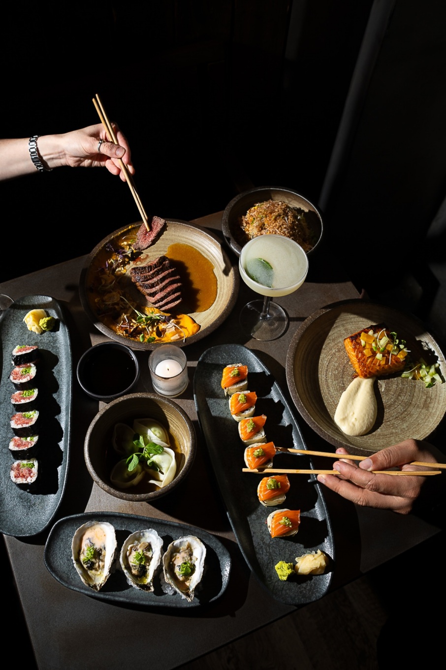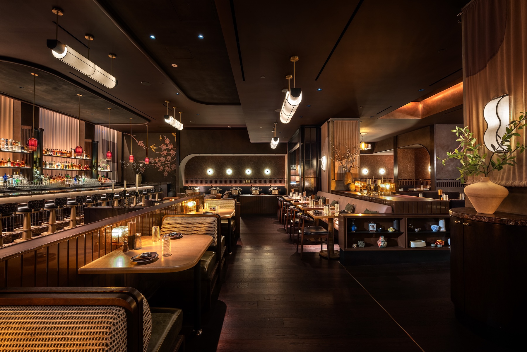 There’s no shortage of seating at Double Knot. Including two private dining rooms, two cocktail bars, a sushi bar, and a bar in front of the grill, the space can seat more than 300 guests, many of them at banquettes. Upstairs, the dining room is dark and moody with lots of earthy and gold tones, and pops of flowers and branches in large vases.