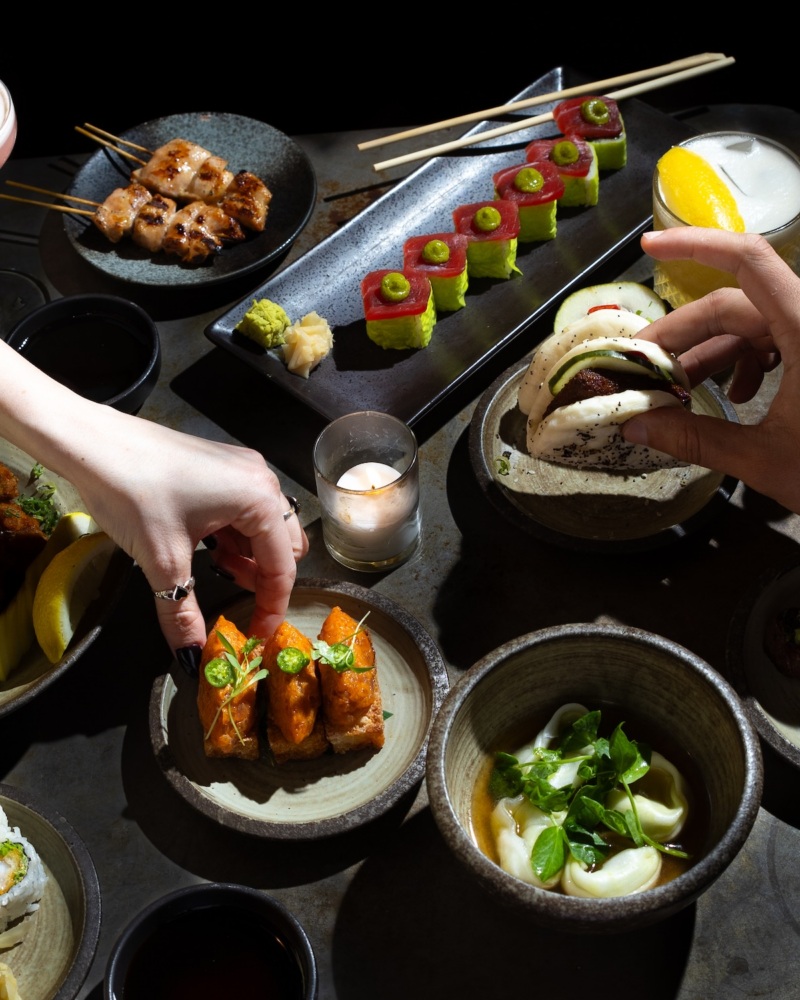 The signature edamame and truffle dumplings; pork scrapple bao; and black cod fried rice. Don’t overlook grilled skewers from the robatayaki section and sushi prepared with warm rice. -
