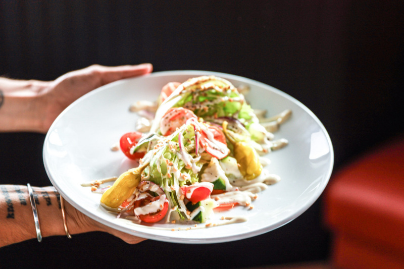 “For a table of two, you’re definitely going to have a good time starting off with the wedge along with the focaccia. And it’s not your run-of-the-mill wedge salad,” Hudec says. The dressing is the star: “You would swear to God the dressing has dairy in it, but it’s vegan. It’s confit raw garlic, sherry vinegar, and two types of tofu blended together: soaking tofu and medium-firm tofu,” he says.