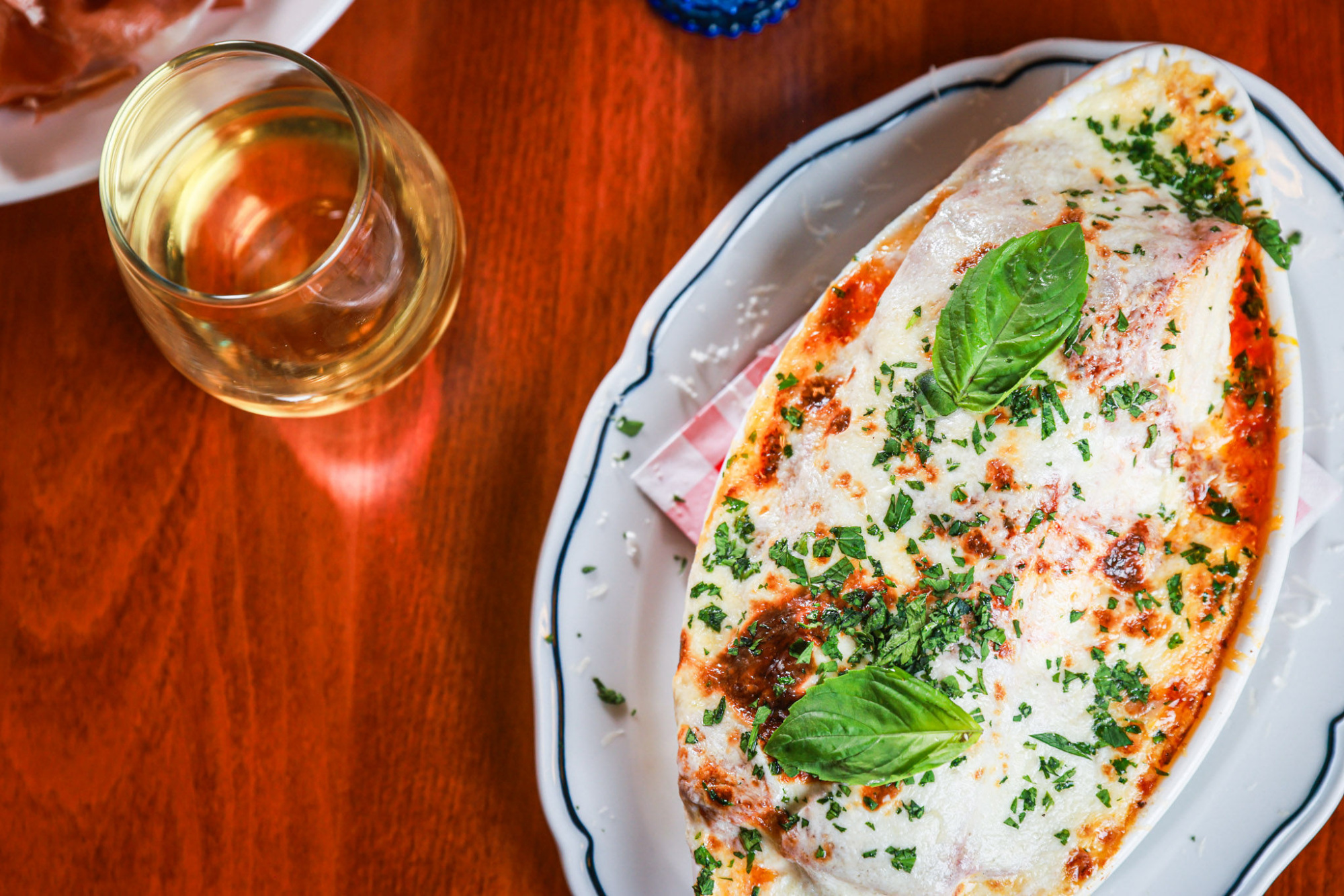 Once plated, the lasagna is finished with more red sauce, a heavy hand of Parmesan, and a thick slab of imported loaf mozzarella melted over the top. “From the moment it’s ordered, it takes about 15 minutes to hit the table because it takes a bit to heat through,” Hudec explains.