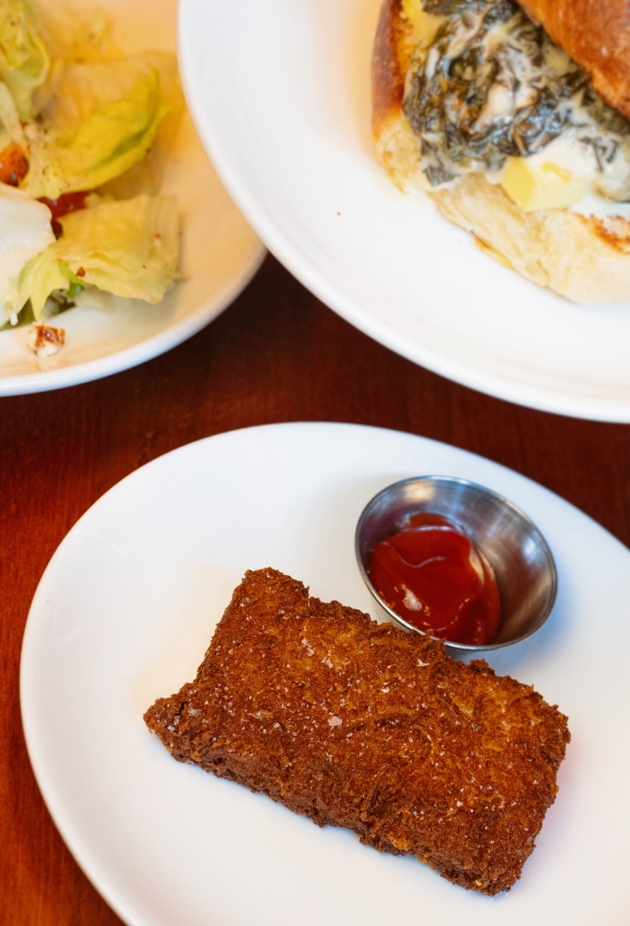 “When we were thinking about how we would serve brunch potatoes, we felt we could either do something completely different or go with confit cracked potatoes, which I’ve done at half a dozen other restaurants,” Hudec says. “This just seemed more interesting. Our process starts with russet potatoes — we bake them to a precise temperature, scoop out the innards, and discard the skins. Then we shred the potatoes and mix them with a ton of black pepper, Parmesan, and salt. We form the mixture into sheets and freeze them, and when it’s time to serve, we break the sheets apart and deep-fry them. Once it’s on the plate, you get these amazing little explosions of fried cheese coming out of the sides.”