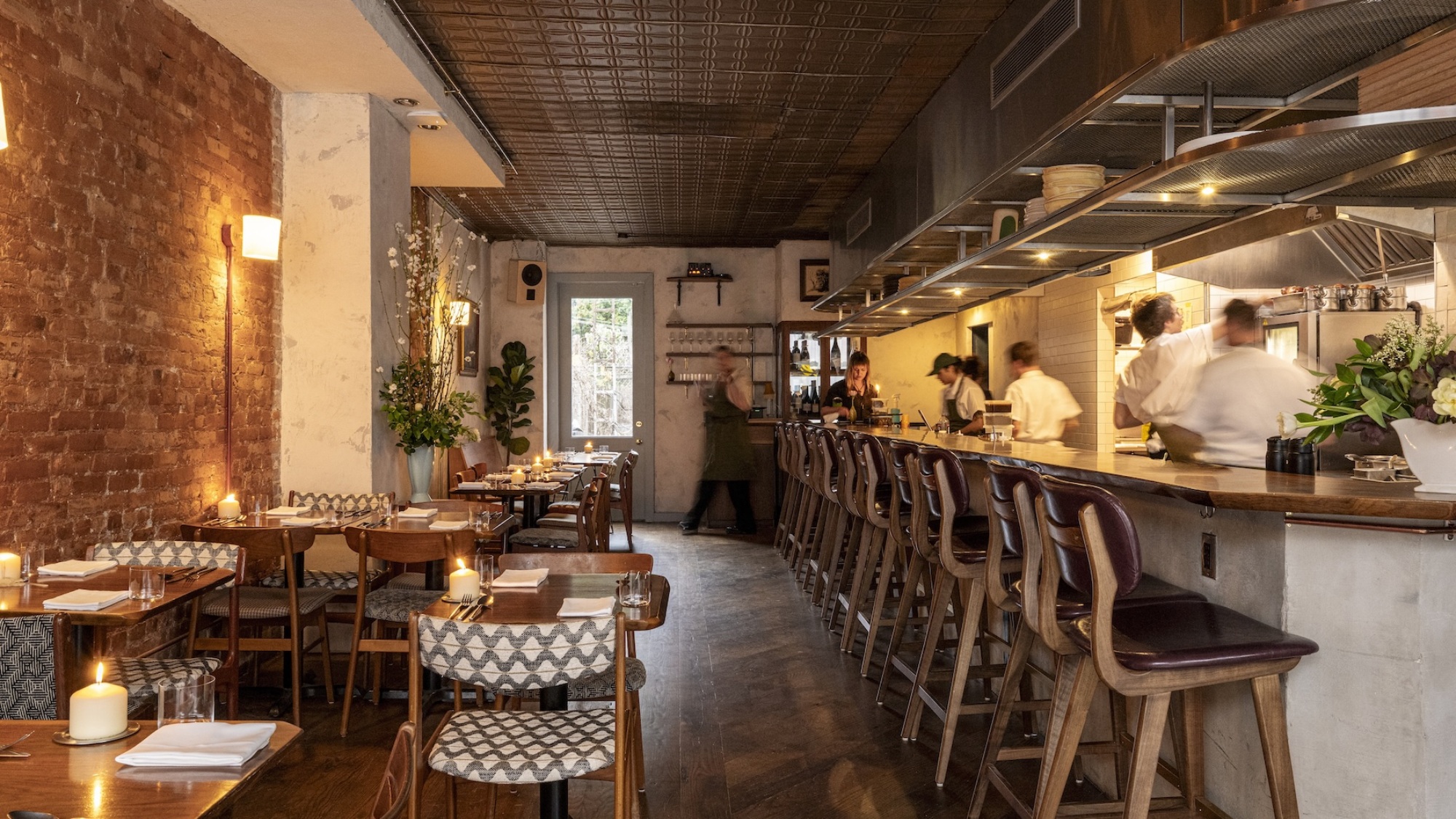In keeping with the local vibes, everything from the upholstery to the woodwork in the new space was made by Greenpoint residents. Ceramicist Jordon Colón was responsible for all the plates; Jeva Design Studio was behind the plasterwork; and Brian Welch was responsible for the gorgeous walnut tabletops, bar, and shelving. Look closely and you’ll note that the two-top tables neatly slot into one another when you push them together, forming a perfect whole.