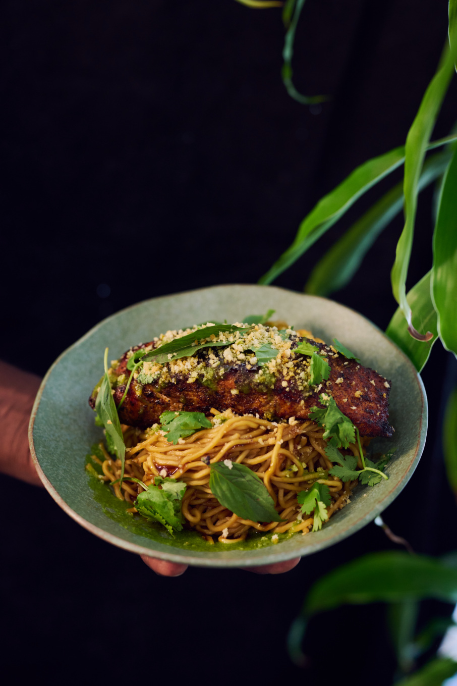 Johnson: It’s summer year-round in California, so we always have summer squash. We blister the zucchini, spike some mayo with Gloria’s Shito. It’s this spicy, creamy sauce at the bottom with these nicely charred but still firm pieces of zucchini on top. Then we toss dill, mint, cilantro, Thai basil, a little arugula, all dressed in white balsamic with the oil from the bottom of the bowl, some za’atar and toasted panko on top.